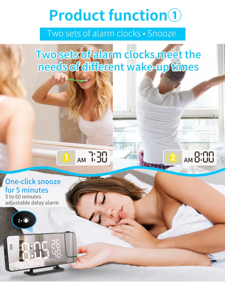 Dual alarm clock function: 2 alarm clocks can be set to any date separately, also set snooze mode.