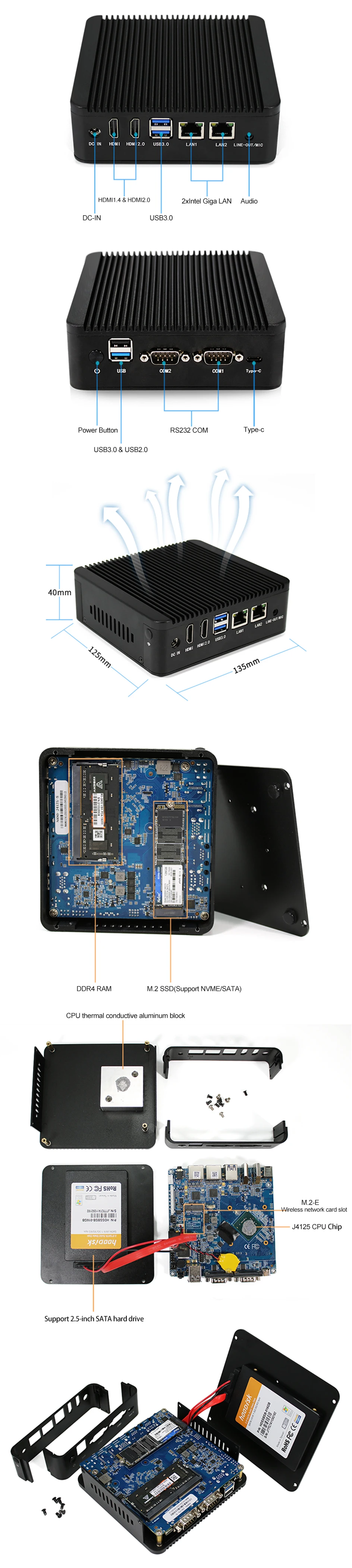 J4125: 1xM.2 2280 SATA/NVME SSD + 1xmSATA SSD + 1x2. 5'sata SSD/HDD.