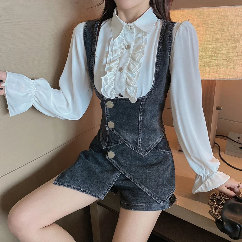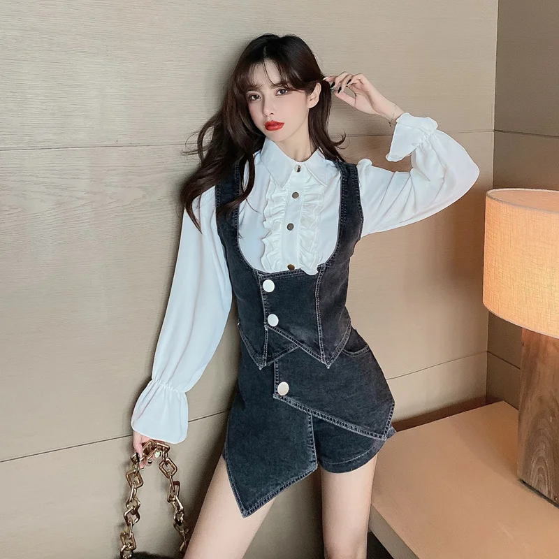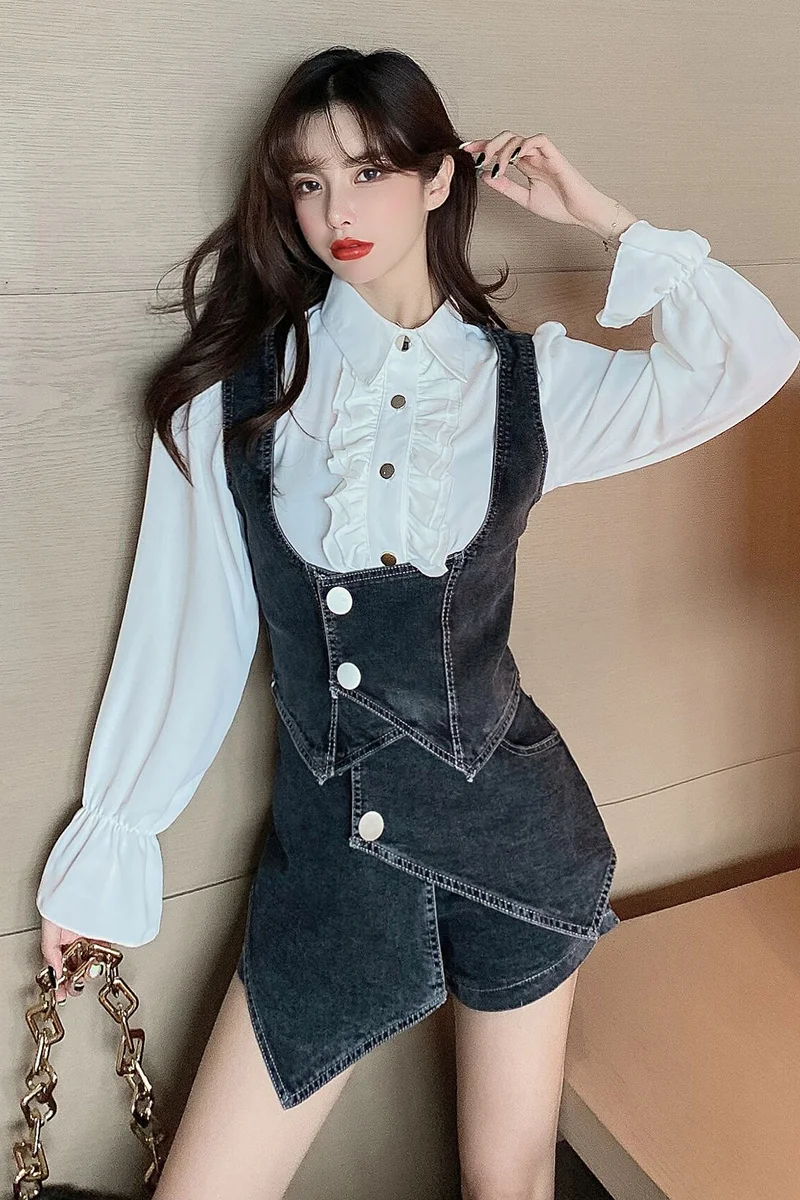 Джинсовый жилет из трех предметов + юбка-штаны + рубашка