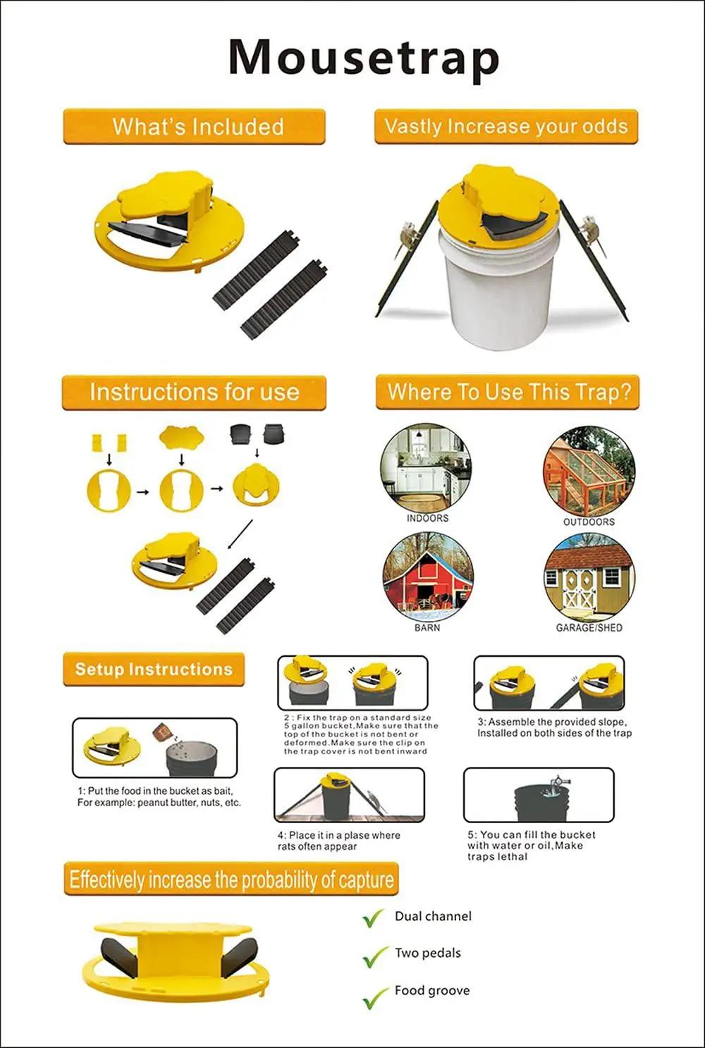 【Специально предназначено для использования в ловушке и отпуске, но можно заполнить ведро водой, чтобы сделать ловушку опасной. [Ведро на 5 галлонов не входит в комплект]