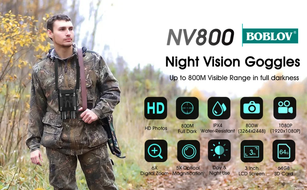 Удобный экран 3 "640x48 0 для отличного просмотра 850нм осветитель/2,7 'Датчик COMS, увеличивает передачу на светильник. Идеальное расстояние 400 м-800 м для ночного наблюдения за птицами, кемпинга, наблюдения за дикой природой, безопасности, наблюдения. 64 Гб свободного хранения памяти, питание от 8 батареек AA (не входят в комплект) или банка питания (не входят в комплект), повторная воспроизведение, водонепроницаемость IPX4, 1/4 ''крепление штатива (1 штатив) И с ремешком на шее Замечательные инфракрасные очки могут делать фотографии и видео стабильно, и воспроизводить такую потрясающую часть памяти с друзьями. BOBLOV предоставляет два года warran-ty для продуктов высокой стоимости, не беспокойтесь о покупке