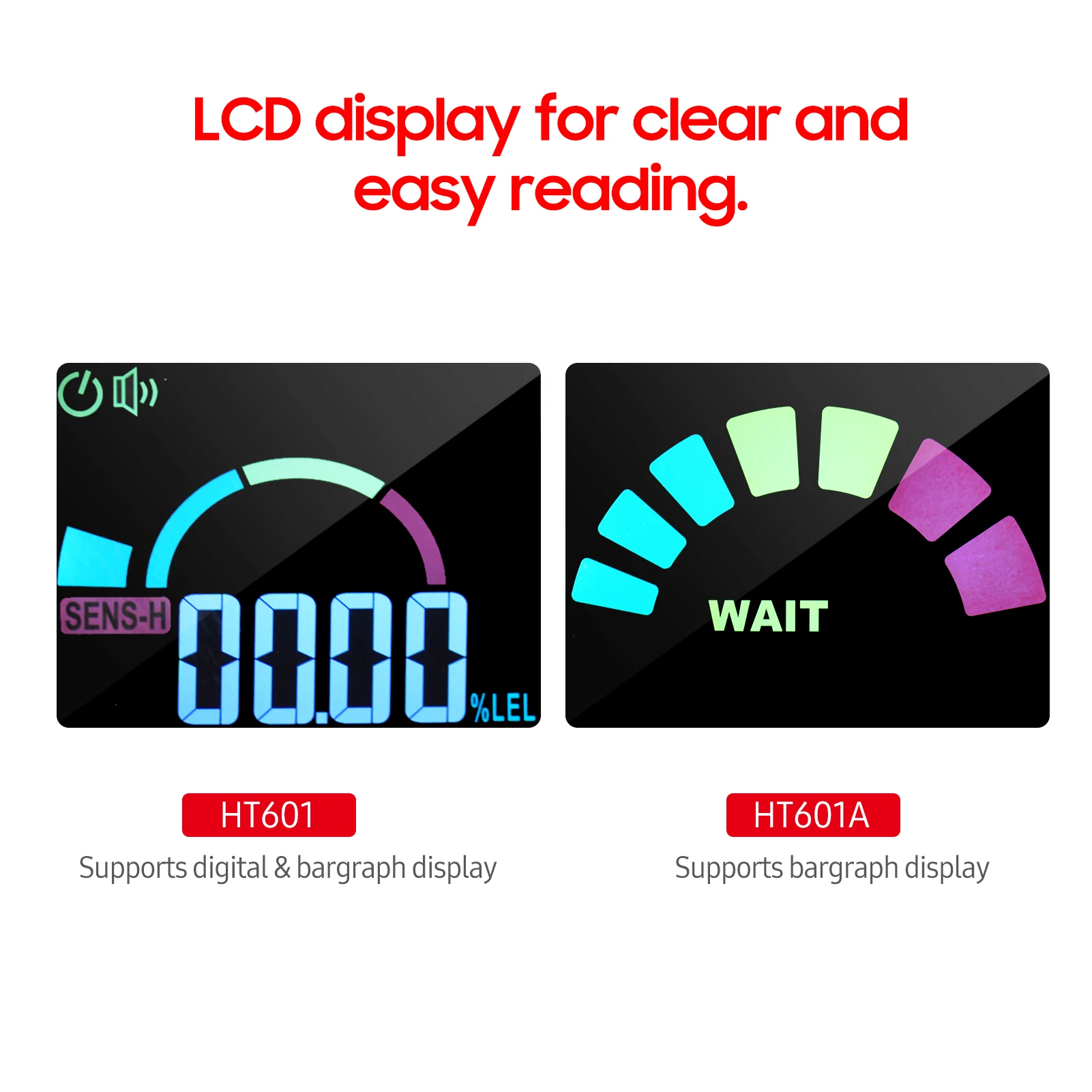 ЖК-дисплей высокой четкости для четкого и легкого чтения, HT601 поддерживает цифровой и барграф дисплей и HT601A поддерживает барграф дисплей.