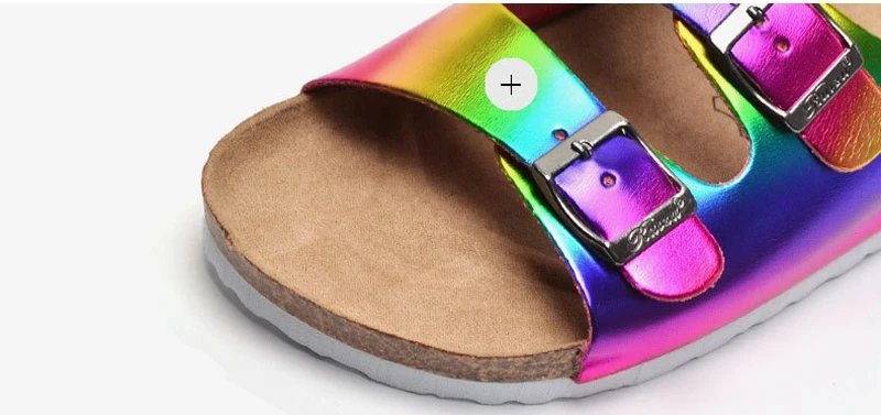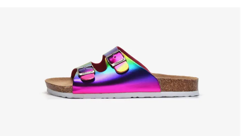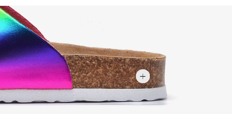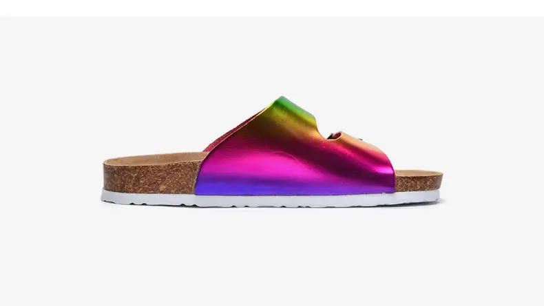 Радужные женские Тапочки на корковой подошве для ношения на улице, повседневные Летняя обувь Два Женские туфли на пряжке; Обувь на плоской подошве с украшением в шлепанцы без задника с открытыми пальцами в стиле ретро для отдыха; Пляжные шлепанцы