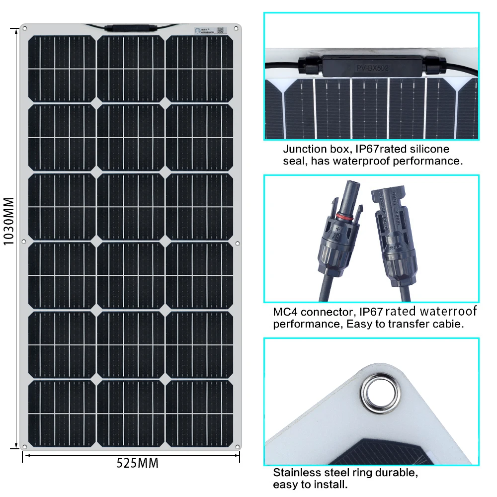 1.[Отличная производительность] Использование высококачественных монокристаллических кремниевых элементов, высокоэффективные монокристаллические Кремниевые Солнечные элементы обеспечивают хорошую производительность даже в условиях низкого уровня светильник2.[Гибкий] Эта гибкая солнечная панель является хорошим выбором для изогнутых поверхностей RV, лодки, парусника, яхты, грузовика, автомобиля, автобуса, кабины, кемпера, палатки, прицепа, тележка для гольфа или любая другая Неровная поверхность.3.[практичность] светильник преобразует электрическую энергию и обладает сильной практичностью. Это хорошее дополнение для нехватки электроэнергии и мест, где городская энергия не может достичь, таких как горы, морские, пустыни и т. Д.4.[хорошие детали] водостойкая Гибкая солнечная панель гораздо прочнее, чем традиционные модели из стекла и алюминия; Распределительная коробка герметичная и водонепроницаемая.5.[Простая установка] Солнечная панель имеет 6 отверстий для крепления, а также может быть установлена с помощью силикона и клейкой ленты. 12 месяцев гарантии обслуживания.Упаковочный лист