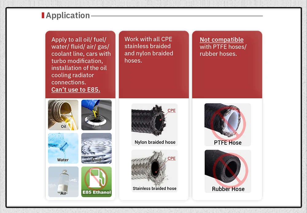 Применяется ко всем масляным/топливным/водным/жидким/воздушным/газовым/охлаждающим линиям, автомобилям с турбомодификацией, установке соединений масляного охлаждения радиатора. Не может использоваться для E85.Работает со всеми CPE нержавеющими плетеными и Нейлоновыми плетеными шлангами.Не совместим с шланги ПТФЭ/резиновые шланги.7. Посылка включает в себя: как вы выбрали