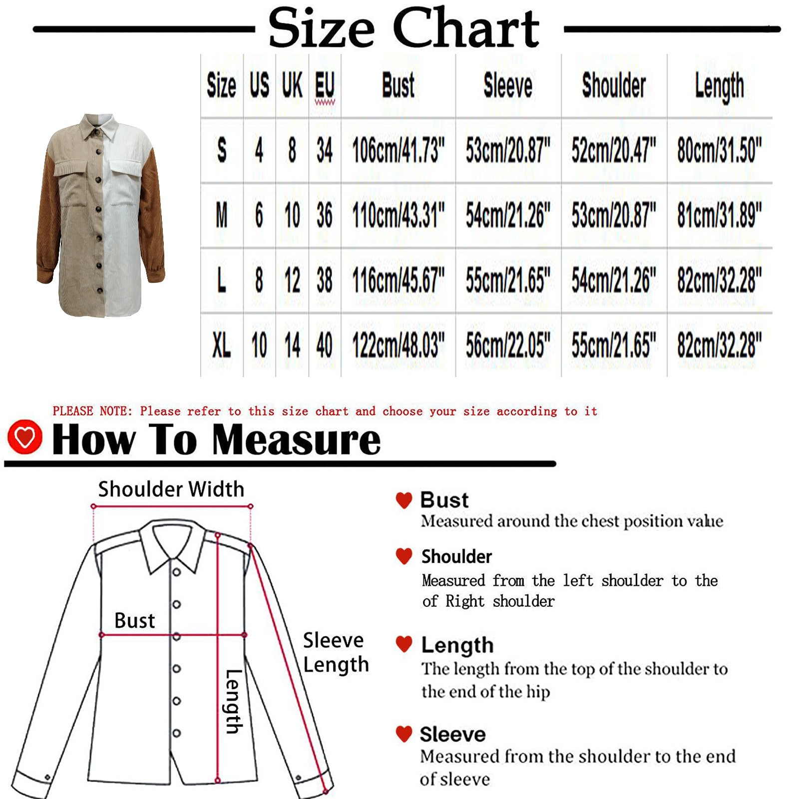 Размеры США Великобритания ЕС Бюст Рукав Плечо Длина S 4 8 34 106 см/41,73'' 53 см/20,87'' 52 см/20,47'' 80 см/31,50'' М 6 10 36 110 см/43,31'' 54 см/21,26'' 53 см/20,87'' 81 см/31,89'' L 8 12 38 116 см/45,67'' 55 см/21,65'' 54 см/21,26'' 82 см/32,28'' XL 10 14 40 122 см/48,03'' 56 см/22,05'' 55 см/21,65'' 82 см/32,28''