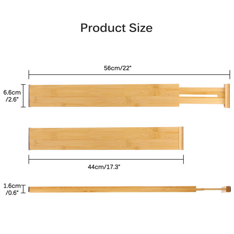 100% сделанный вручную экологически чистый Бамбуковый материал приносит Супер Гладкие, прочные и прочные разделители ящиков для вашей здоровой жизни. После затягивания пружины Длина 44 см/17,32 дюйма; Растягивающаяся длина может достигать 56 см/22,05 дюйма.