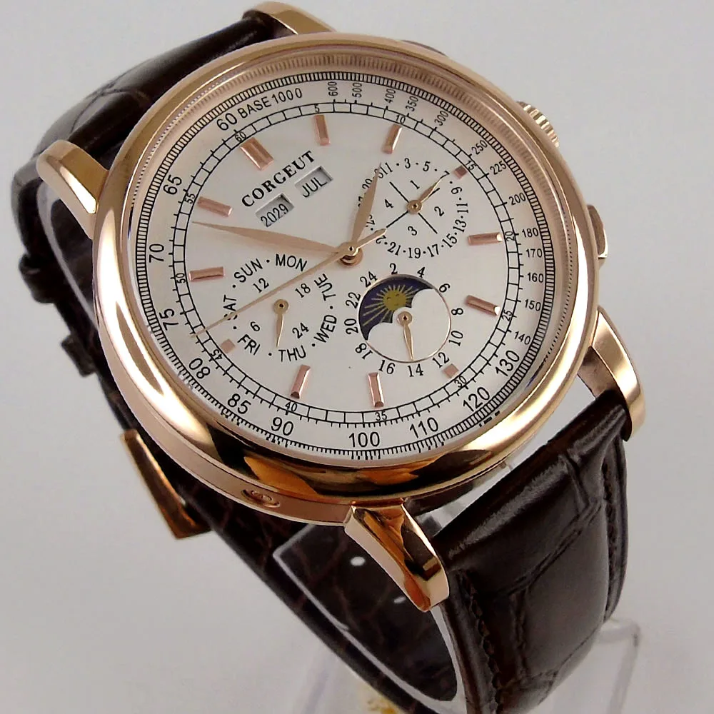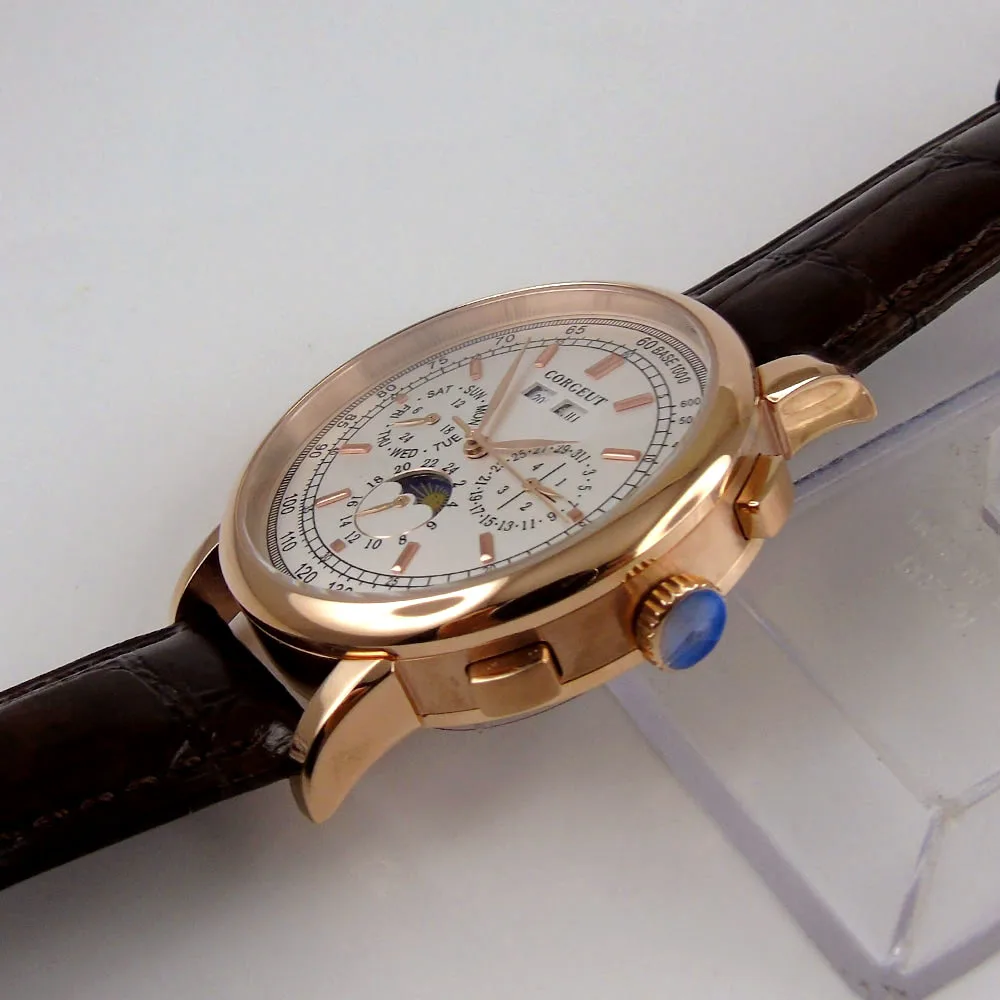 A: золотой чехол с белым циферблатом и коричневым ремешком