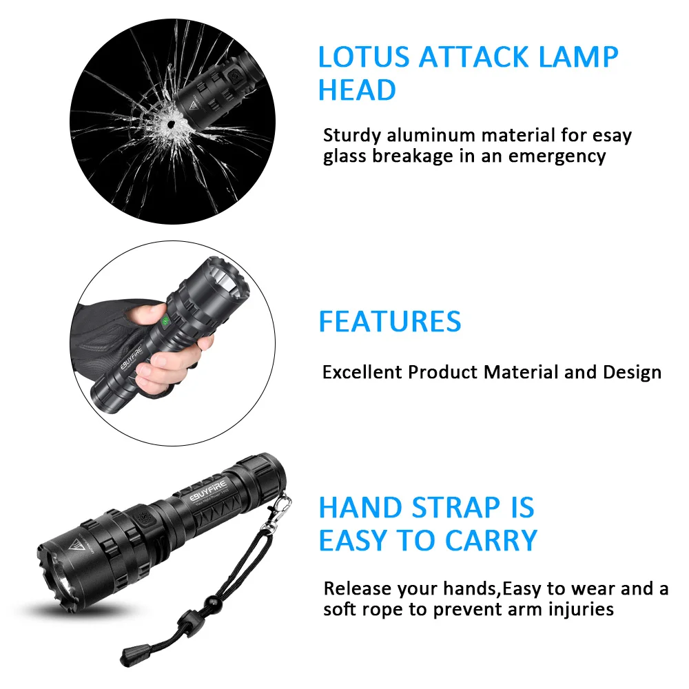 1. Lens: good light transmission performance, not easy to damage, strong aluminum attack head to protect the lens from abrasion;
