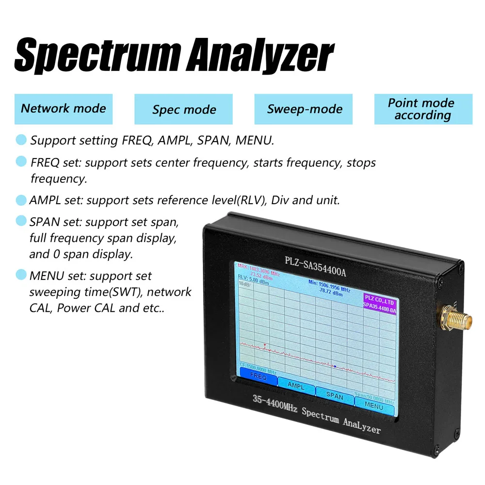 Это своего рода анализатор спектра качества, который изготовлен из алюминиевого сплава материала, износостойкости и может обеспечить длительный срок службы. С Полноразмерным сенсорным ЖК-экраном, 4 режима работы, регулируемые, вы можете настроить режим сети, режим спецификации, режим развертки, точечный режим в соответствии с вашими требованиями. Поддержка настройки FREQ, AMPL, SPAN, MENU. Вы можете попробовать.