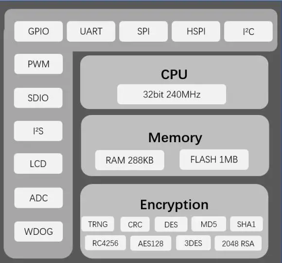 В W806 Чип-это безопасный микрочип IoT MCU. Чип интегрирует 32-разрядный Процессор процессор, встроенный UART, GPIO, SPI, SDIO, I2C, I2S, PSRAM, 7816, ADC, ЖК-дисплей, TouchSensor и других цифровых интерфейсов; поддерживает TEE security engine, поддерживает несколько аппаратных алгоритмов шифрования и дешифрования, встроенный DSP, блок плавающей точки и двигатель безопасности, Поддержка настройки разрешения безопасности кода, встроенная флэш-память 1 Мб, поддержка нескольких мер безопасности, таких как хранение шифрования прошивки, подпись прошивки, отладка безопасности, обновление безопасности и т. д. Для обеспечения безопасности продукта.