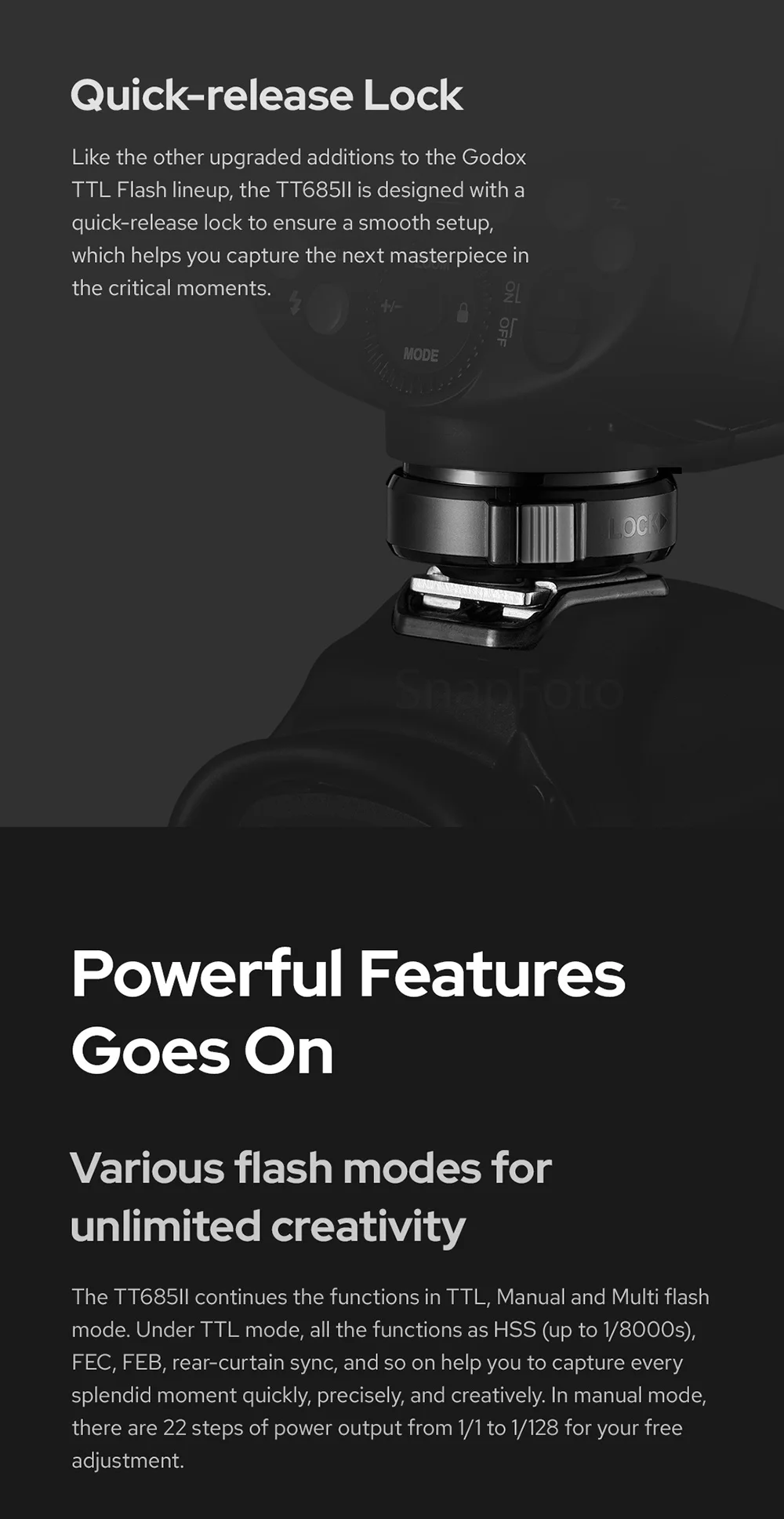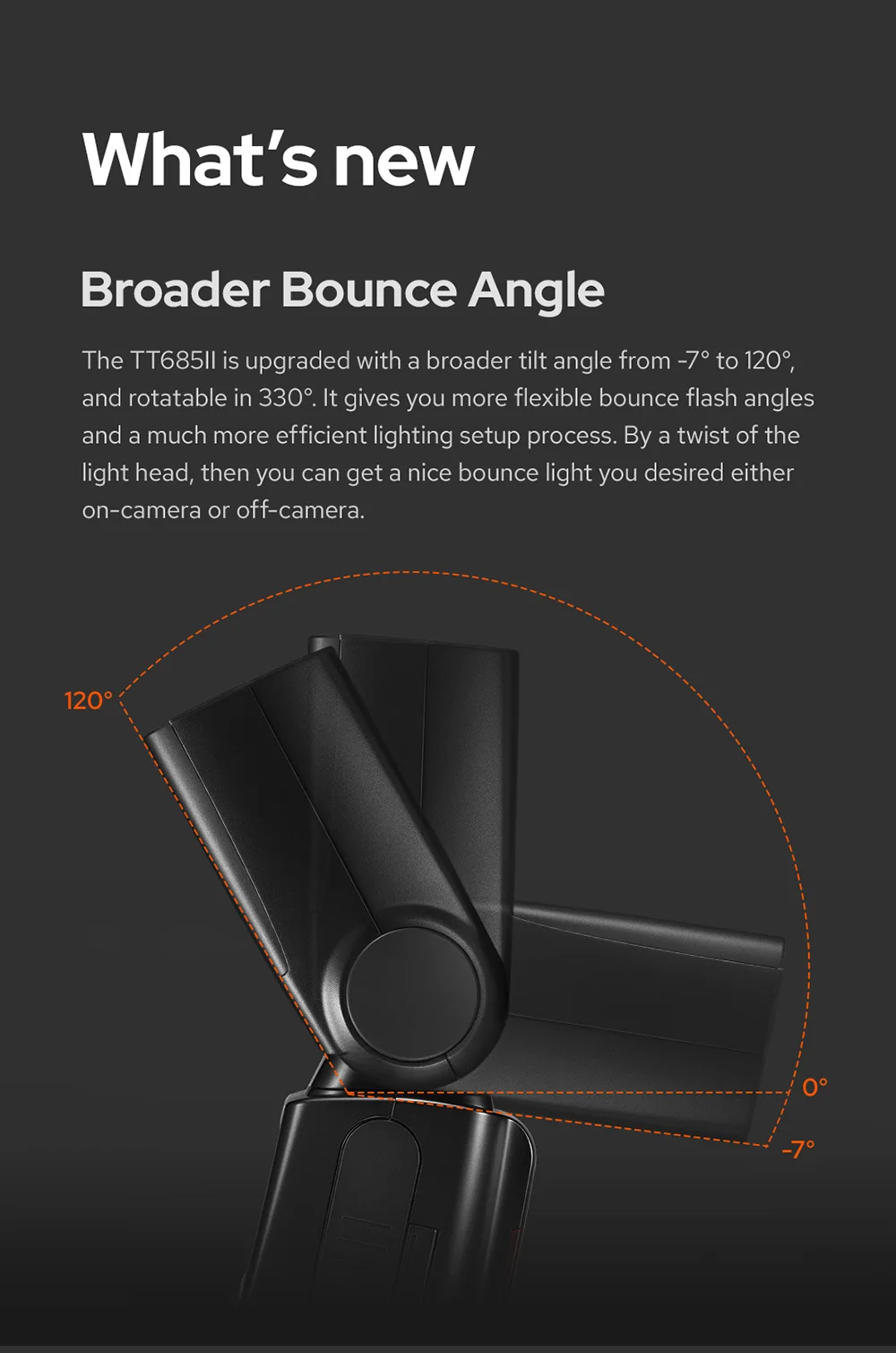 3 、 【Powerful 【особенности TT685II имеет HSS (но не более чем на 1/8000s), FEC, FEB, задний занавес синхронизации и другие функции в TTL режим. Есть 22 уровня выходной мощности от 1/1 до 1/128 в ручном режиме для вас, чтобы настроить свободно. В то же время TT685II имеет два режима масштабирования: Автоматическое/ручное. Покрытие вспышки составляет 20-200 мм.