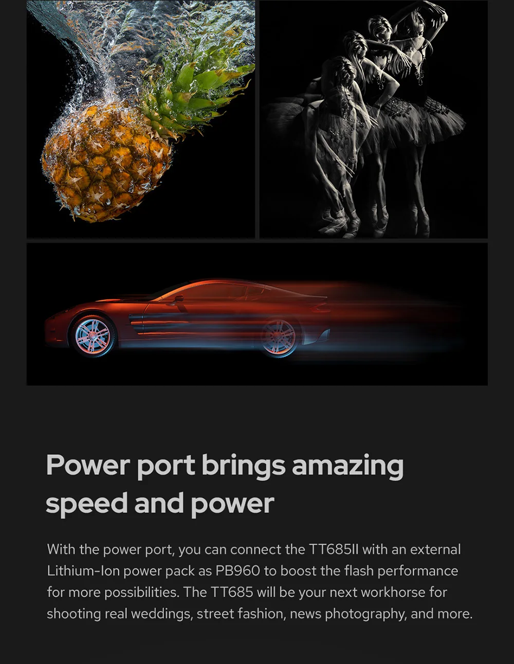 4. 【Внешний порт питания 】 TT685II оснащен внешним зарядным интерфейсом, совместим с внешней вспышкой Godox PB960 (продается отдельно), что значительно повышает производительность вспышки, сокращает время переработки, улучшите Срок службы батареи, подходит для свадебных сцен, уличной моды, событий новостей и других изменяемых сцен.