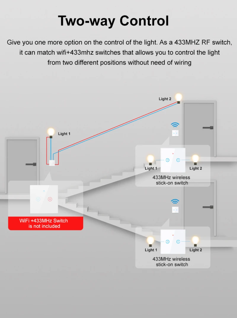 6. Мульти-контроль управления: он может сочетаться с несколькими беспроводными переключателями для достижения эффекта управления огнями в нескольких местах