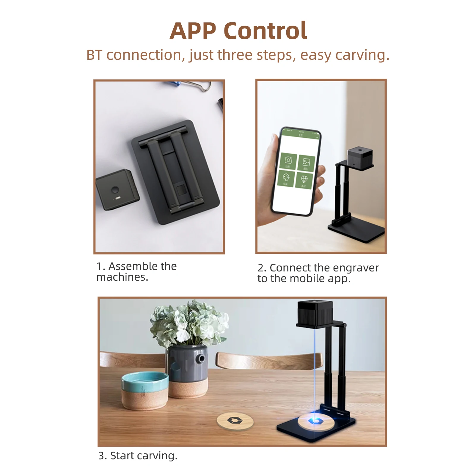 APP Control: BT wireless connection with mobile phone APP, which allow to create any patterns and words, modify the pictures or photos to engrave. Preview mode can help users confirm the size and position of the pattern on the target surface.