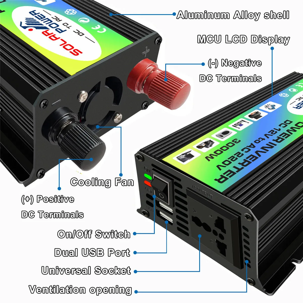 3000 Вт Инвертор-автомобильный инвертор с 2 usb-портами и выходом переменного тока. Всплеск напряжения: 3000 Вт, инвертор питания поставляется с бесплатным прикуривателем и 2 зажимами батареи.