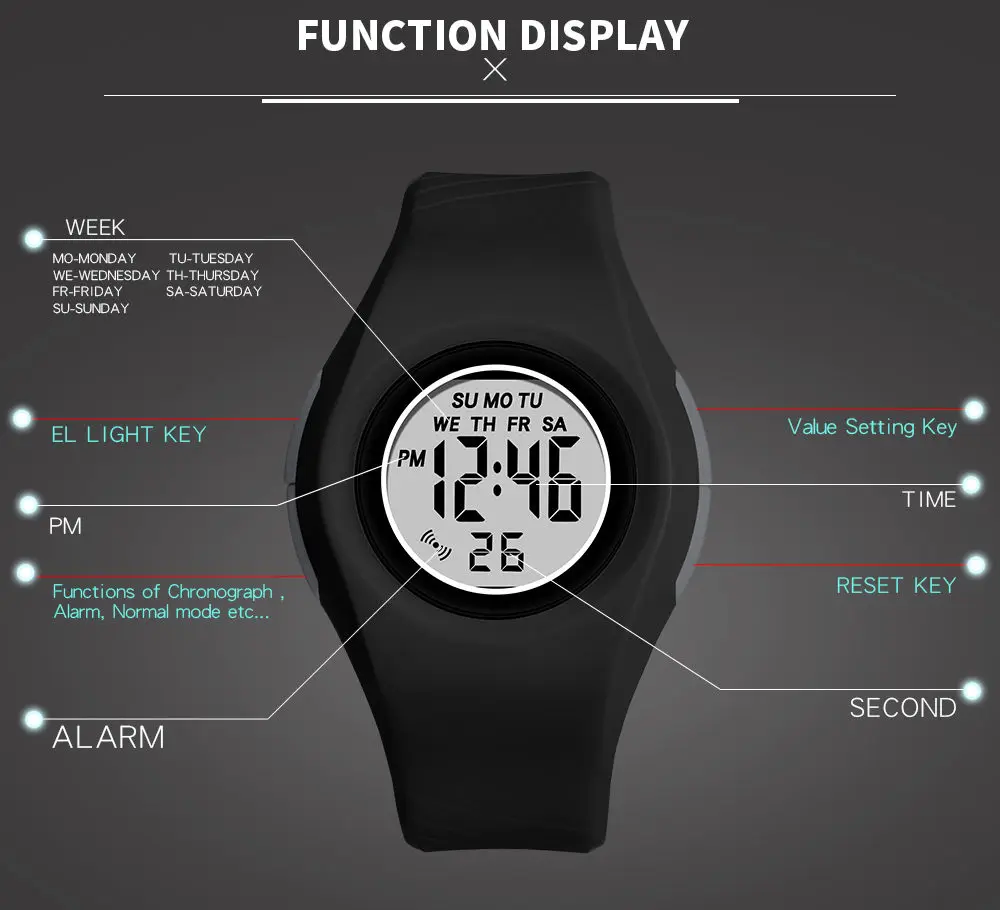 Function: Alarm clock, day of the week, date display, hourly time, stopwatch timing, luminous display, WR50M swimming waterproof, 12/24 hour system