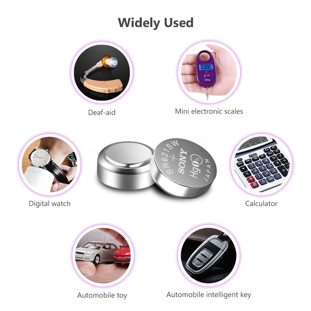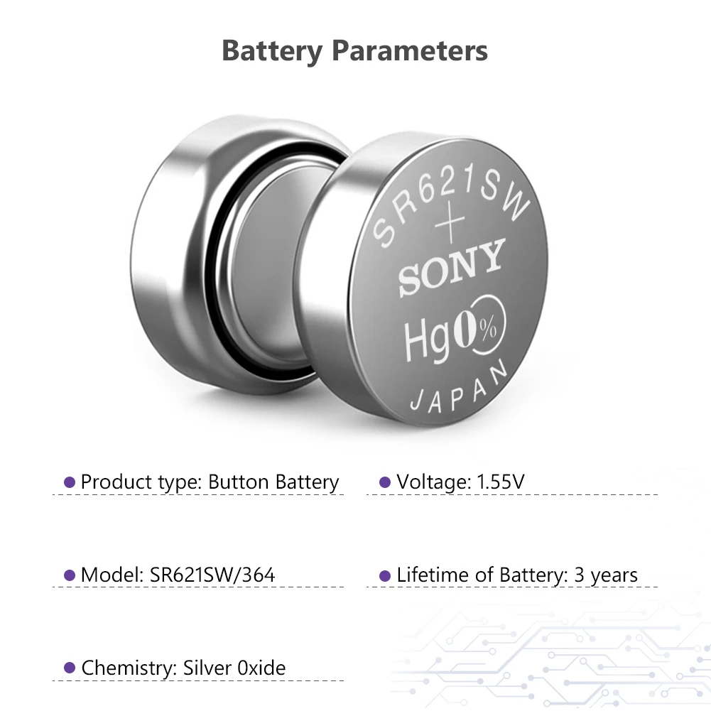5 шт. для Sony Оригинал 1,55 V 364 SR621SW V364 SR60 SR621 AG1 часы батарея Серебряная оксидная Кнопка монета батареи сделаны в Японии Особенности 100% Новинка! Высокое качество 364/363/SR621SW батареи кнопки монет батареи, большая мощность для миниатюрные устройства. Прочный и экономичный, высокая плотность энергии, обеспечивает более длительный срок службы батареи и длительную мощность. Безопасность и отсутствие утечки, без ртути класса А, протестированы под строгими стандартами контроля качества. Используется для электрической игрушки, калькулятора, материнской платы компьютера, часов, камеры, автомобильной охранной сигнализации, автомобильных пультов без ключа, электронного слухового аппарата, КПК, электронных органайзеров, Ошейников для домашних животных, счетчика, дистанционного управления, электронного инструмента, измеритель уровня глюкозы в крови, измеритель уровня холестерина, светодиодный светильник и другие электронные приборы. Также известный как:AG1, LR621, D364, SP364, 602, 164, 280-34, SB-AG/DG, SR60, SR60L, SR621, GP364, T, V364,531, 364A, CX60, G1, LR60, LR621W, T, TR621, TR621SW,И т. д. Технические характеристики Модель: 364/363/SR621SW Химия: оксид серебра Номинальное напряжение: 1,55 в Номинальная емкость: 19 мАч Срок годности: От 2 до 3 лет Перезаряжаемый:Нет(Одно использование) Диаметр: 6,8 мм/0,27'' Высота: 2,1 мм/0,08'' Эквивалент/Замена для: AG1, LR621, D364, SP364, 602, 164, 280-34, SB-AG/DG, SR60, SR60L, SR621, GP364, T, V364,531, 364A, CX60, G1, LR60, LR621W, T, TR621, TR621SW,И т. д. Внимание 1. Пожалуйста, допускайте небольшое отклонение цвета между бумажными картами и изображениями. 2. Пожалуйста, храните изделие батареи недоступном для ваших детей в чехол они глотать. 3. Пожалуйста, храните батареи в сухом и прохладном месте. Посылка в комплекте 5 батарей для монет