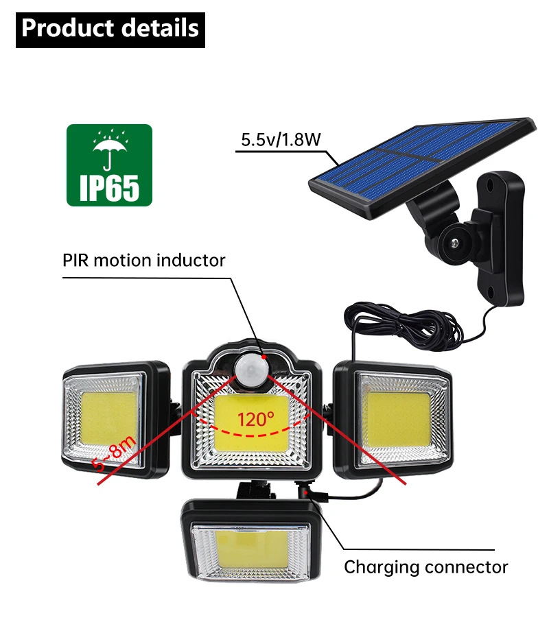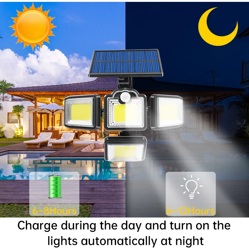 【Супер яркие солнечные наружные огни датчик движения -- 192/198 супер-яркие светодиоды и дизайн 3 регулируемых головок лампы обеспечивают Вам ультра-яркое освещение 6500K, что делает ваш двор таким же ярким, как и в дневное время.