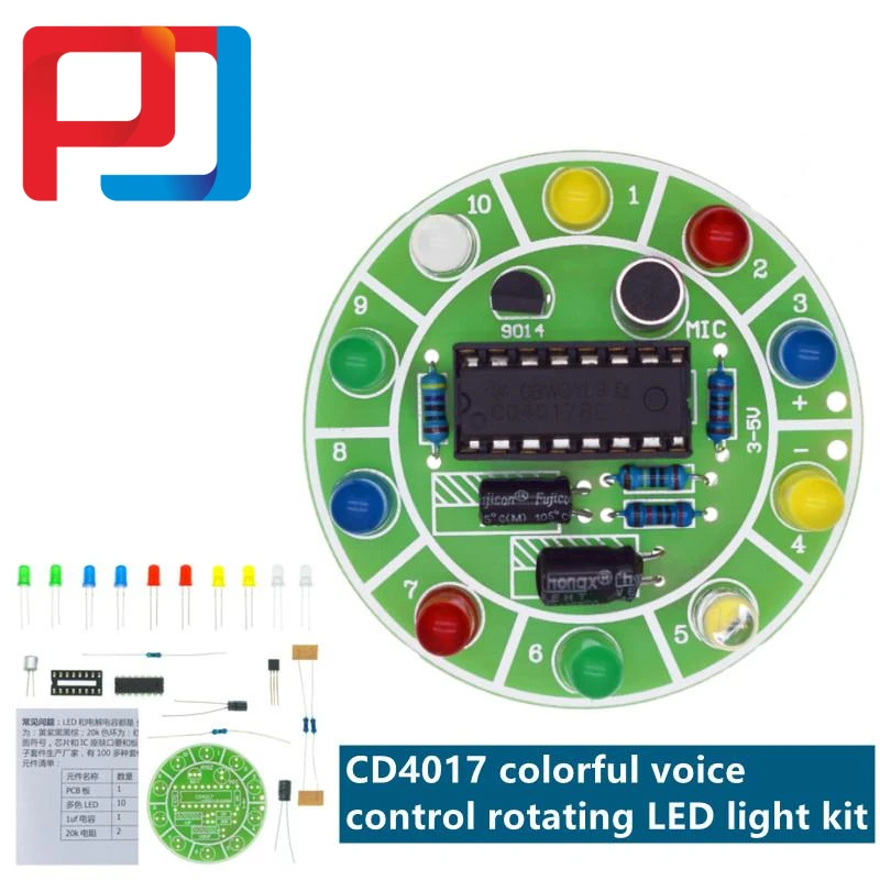 The circuit of this set adopts sound control of 10 LED flowing light, which can show the function of CD4017 intuitively. It is a set of learning counter, frequency divider and color light controller.At the same time, the kit has a good effect, very interesting and practical,.