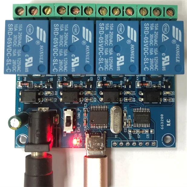 (1) Порт внешнего источника питания: Подключение постоянного тока 5В. В связи с ограниченным выходным током USB рекомендуется использовать внешний источник питания при использовании более 2 реле;