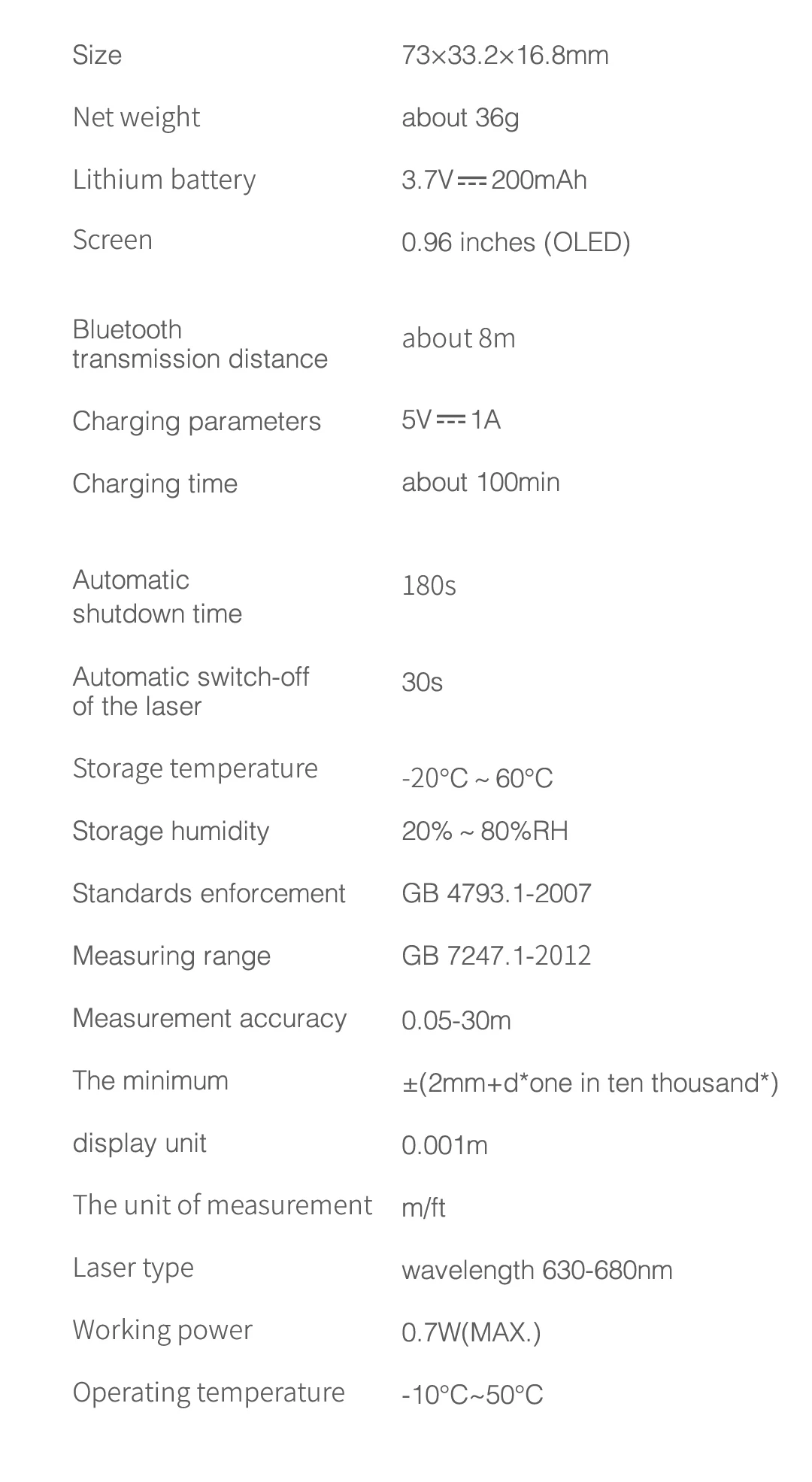 The measuring range is from as near as 0.05m to as far as 30m. The class Il laser is safe for the human body, thus safe to use.