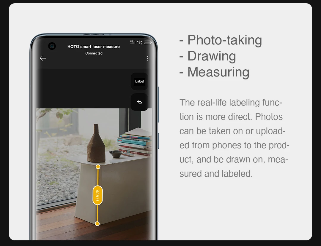 The real-life labeling function is more direct. Photos can be taken on or uploaded from phones to the product, and be drawn on, measured, and labeled.