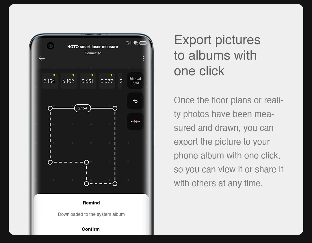 Once the floor plans or reality photos have been measured and drawn, you can export the picture to your phone album with one click, so you can view it or share it with others at any time.