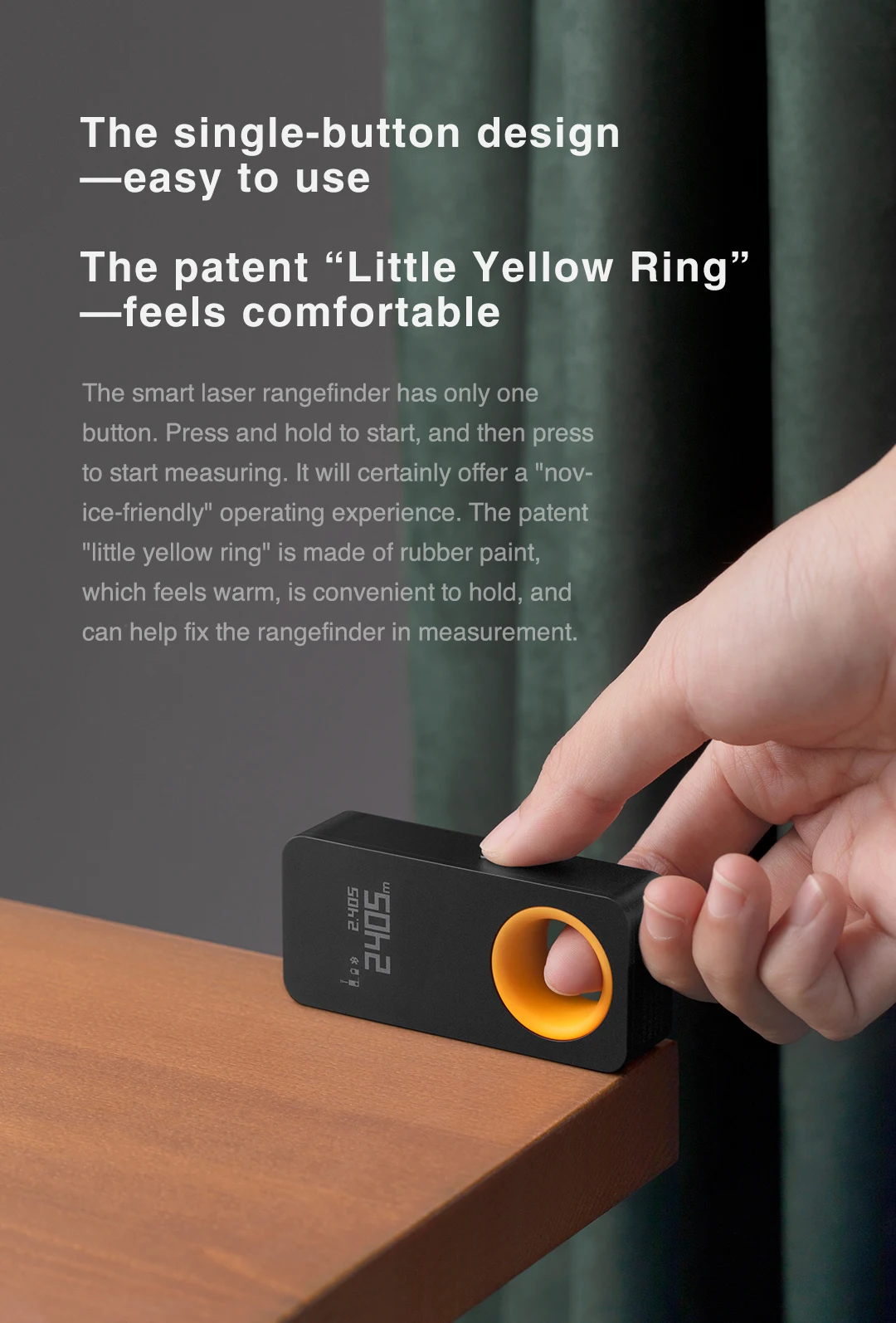 The smart laser rangefinder has only one button. Press and hold to start, and then press to start measuring. It will certainly offer a "novice-friendly" operating experience. The patent "little yellow ring" is made of rubber paint, which feels warm, is convenient to hold, and can help fix the rangefinder in measurement.