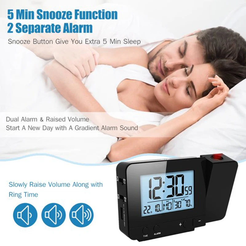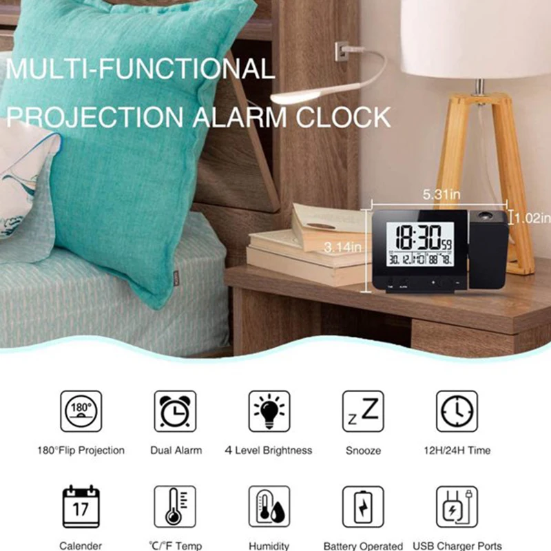 180 ° время и температура проекции-- Вращающийся на 160 ° проектор может проецировать ультра-четкое время и температуру на ваших стенах или потолке; Мульти-регулировка угла с 180 ° обратной кнопкой для удовлетворения любых случаев. Когда вы просыпаетесь, первое, что приходит в ваши глаза-это время и температура.