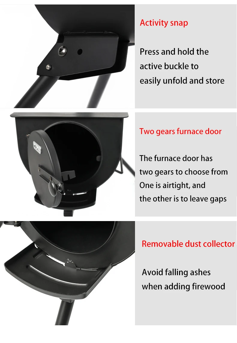 Эта печь для кемпинга используется для отопления и приготовления пищи. Он имеет дымоход для хорошей вентиляции и эффективности горения. Складные боковые стойки и ножки делают их компактными для удобного хранения и транспортировки. Это отличный выбор для кемпинга, альпинизма, ледовой рыбалки и выживания на открытом воздухе.