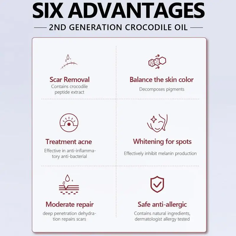 Эффективность: формула, добавленная с крокодиловым маслом, предназначена для эффективного сглаживания и уменьшения появления шрамов при ремонте кожи и предотвращения аномальных шрамов. Он также может осветлить шрамы, восстановить лечение акне, анти-окисление, отбелить, молодой и красивый, успокаивает кожу, оставляя кожу увлажненной и мягкой.