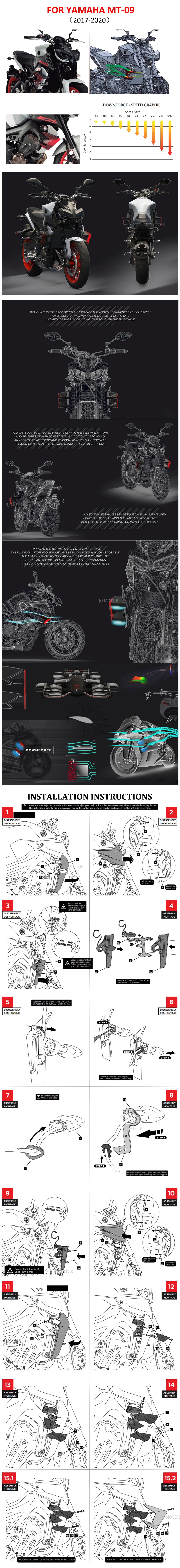 -MT-09 Yamaha состоит из двух частей. С одной стороны, 4 матовые черные спойлеры, с каплевидной секцией, которая была тщательно разработана и изучена, чтобы быть аэродинамически эффективной и идеально адаптируется к радиатору вашего MT-09, действуя в качестве спойлеров и обеспечивая понижение на переднюю ось, чтобы обеспечить большую Потливость и безопасность при торможении, а также эффект Анти-wheelie.