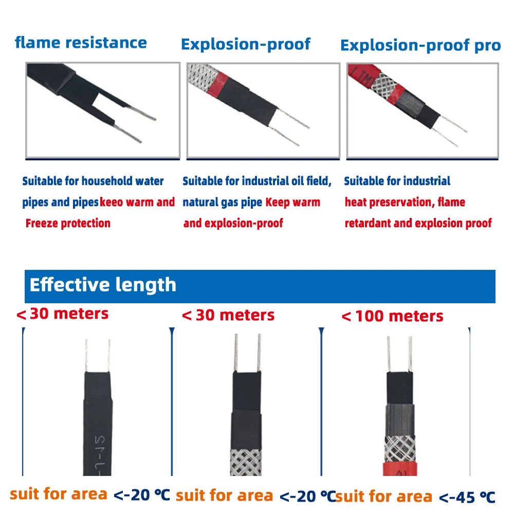 Нефть, химическая промышленность, железо и сталь, электроэнергия и так далее Храните трубы, резервуары в тепле и предотвращайте обморожение, кровлю и водостоки, таяния снега .Есть однородная основная полоса Материал PTC Между двумя параллельными металлическими шинами. Когда две шины на одном конце кабеля подключены к источнику питания, ток течет сбоку от одной шины через слой материала PTC к другой шине. PTC слой-это нагревательный корпус сопротивления, который непрерывно соединяется параллельно между шинами для преобразования электрической энергии в тепло. Сопротивление сердечников увеличивается с температурой, достигая около 65 градусов, сопротивление настолько велико, что почти блокирует ток, И температура основной полосы достигает высокого предела и больше не поднимается, но автоматически ограничивает температуру. Самоограниченная нагревательная лента имеет равномерную температуру, Не перегревается , Экономит электроэнергию, И имеет Быстрое нагревание Температура. Его можно произвольно разрезать и использовать в течение самой длинной длины электрического нагревательного ремня, и его можно перекрывать и перекрещивать.Кабель предназначен для домашних водопроводных труб и солнечных верхних водопроводных труб для защиты от замораживания зимой, для поддержания воды в трубах выше 0 Цельсия, и не нужен контроллер.
