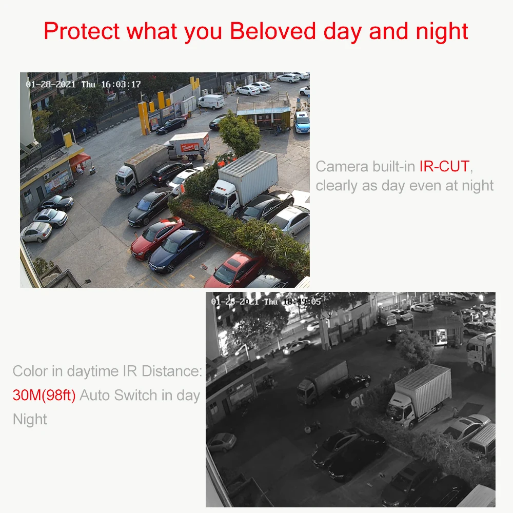 Камера имеет очень хорошее качество ночного изображения. С супер светодиодный свет и инфракрасное излучение для 24-часовой контроль камера ночное видение диапазон составляет до возможностью погружения на глубину до 30 м в темное время суток, хорошая уверенности с точки зрения предотвращения угрозы безопасности. Фильтр с инфракрасным излучением обеспечивает высокое качество изображения-днем и ночью. В течение дня фильтр инфракрасного разреза падает перед объективом, чтобы блокировать инфракрасные огни от входа. Это гарантирует, что они не влияют на цвета кадра. Когда светильник становится слишком низким, этот фильтр автоматически отключается, чтобы включить инфракрасный светильник в объектив камеры. Это когда Полноцветное Изображение превращается в Монохромное черно-белое.