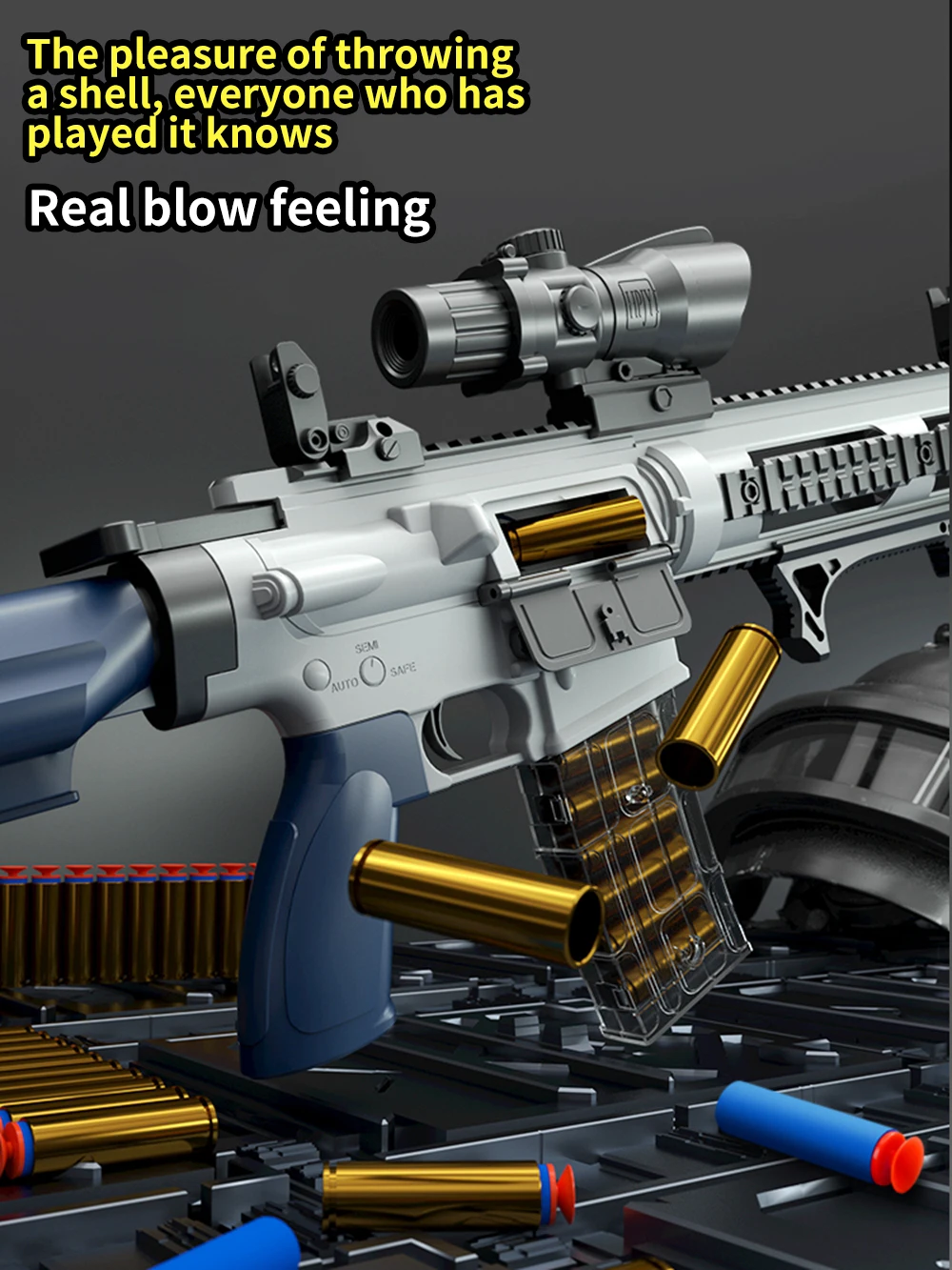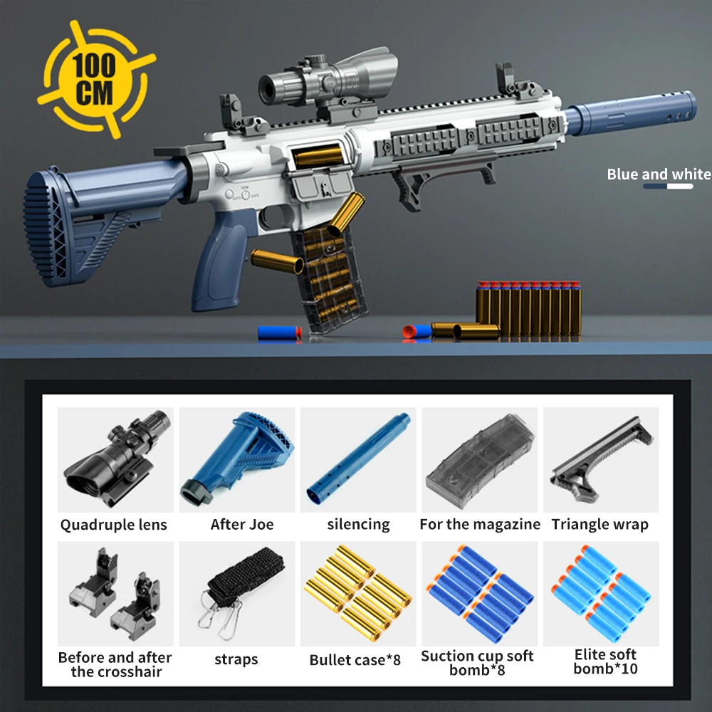 100% brand new and high quality Features: 1. Feel free to shoot, experience the manual trigger, press and hold the button to pull the trigger to send. 2. EVA is safe and flexible, has good resilience, and can be used repeatedly without deformation. 3. Down-feeding magazine mode, smooth feeding, one magazine can hold 8 bullets, and optional magazines and you can experience the fun of changing bombs. 4.Four times adjustable magnification lens to capture every move of the enemy. Specification: Material: Plastic Color: blue and white, red, silver Size: assembled total length 100cm Soft elastic material: EVA sponge soft elastic Loading method: magazine feed Magazine capacity: up to 8 bullets Shooting distance: Straight line distance 15m Parabolic distance 18m Feed mode: lower feed magazine List accessories: gun body*1, quadruple mirror*1, rear support*1, muffler*1, magazine*1, triangle grip*1, front and rear quasi letter*2, strap*1, cartridge case*8, soft suction cup Bomb*10, Elite Soft Bomb*10 Packing list 1*Children's shell throwing soft bullet gun toy