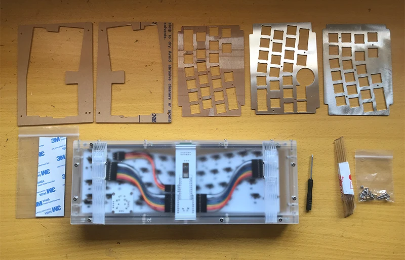 Комплект 1: Акриловый сложенный корпус, металлическая пластина, сплит-печатная плата, расположение кабеля, несколько винтов, силиконовая ножная накладка, переключатель Gateron 40 шт. (желтый, синий, черный, белый, красный, коричневый, зеленый) примечания к заказу