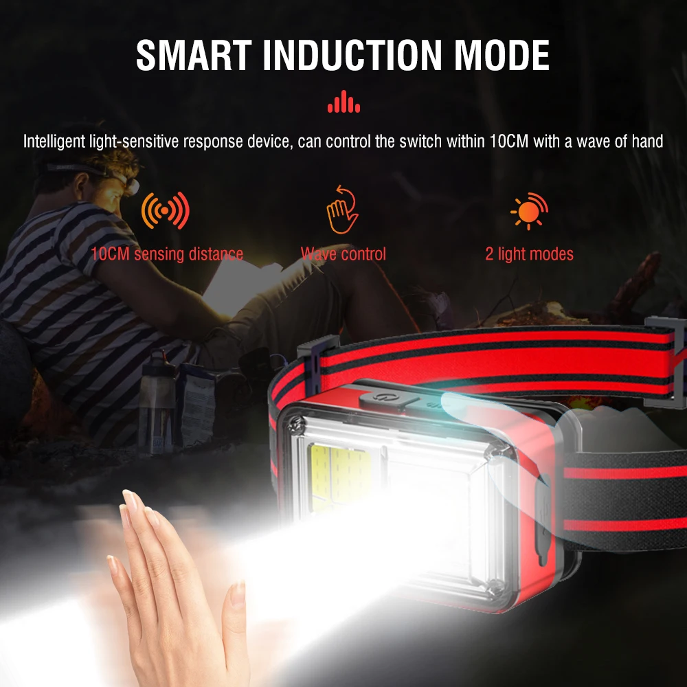 ● 9 режимов освещения. Левая кнопка-индукционный главный светильник вкл.-COB вкл.; Правая кнопка-главный светильник вкл.-полу яркий-COB вкл.-полу яркий-полный ярко-красный светильник вкл.-красный светильник мигает.
