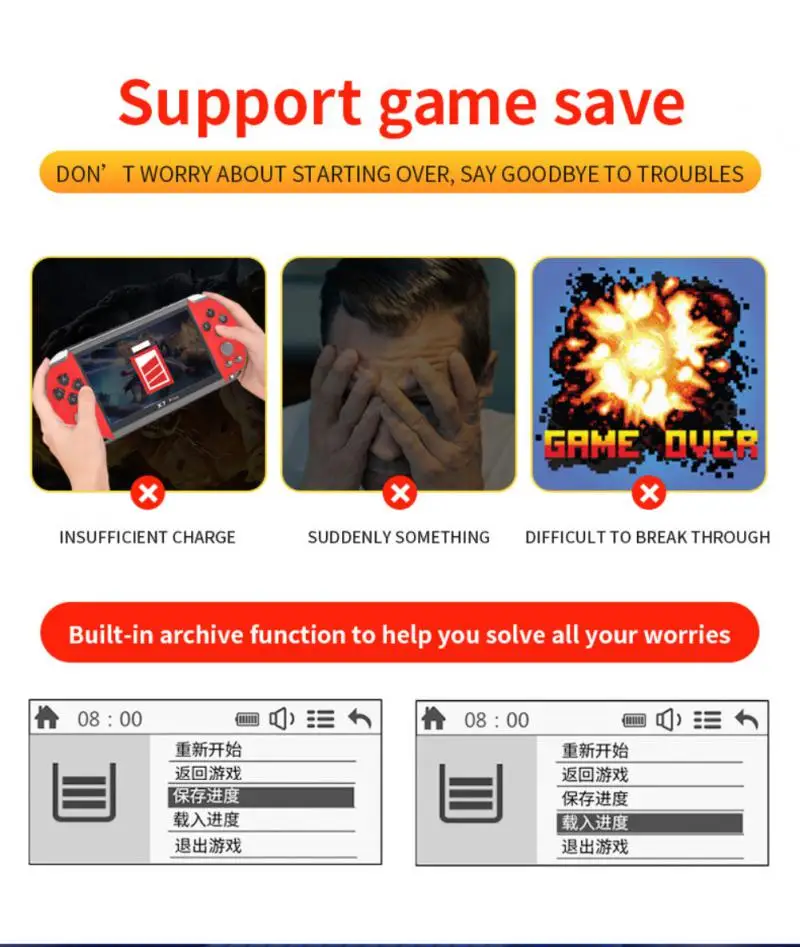 В X7 Ручной игровой консоли имеет 4,3 дюймовый экран высокой четкости, поддерживает 8/16/32/64/128-bit игры, и более чем 10000 игр.