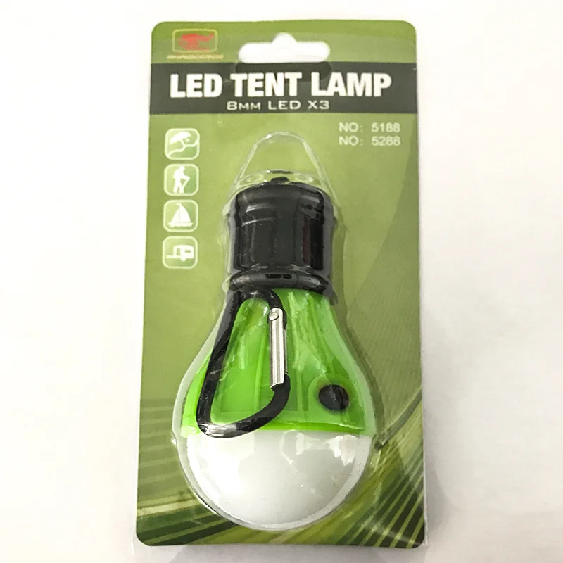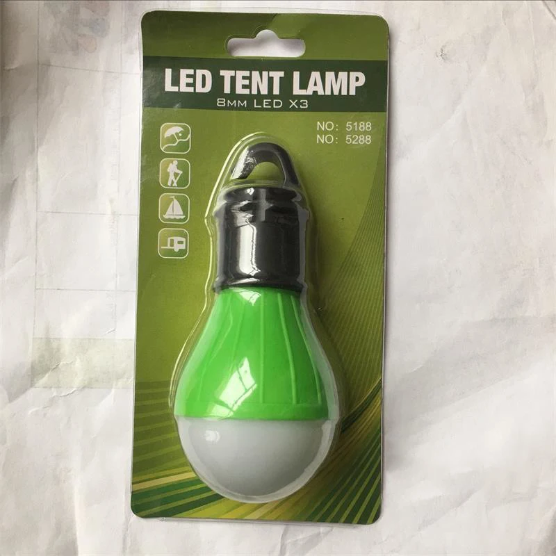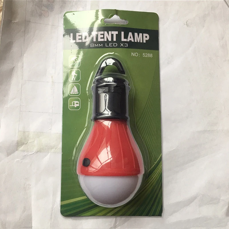 Features: soft, diffuse light tent filled with 3 energy-saving ball LED bulbs. Camping light, a hook hanging from a tent or branch. ABS material, light weight, compact and durable structure. The power consists of 3 AAA batteries (not included).