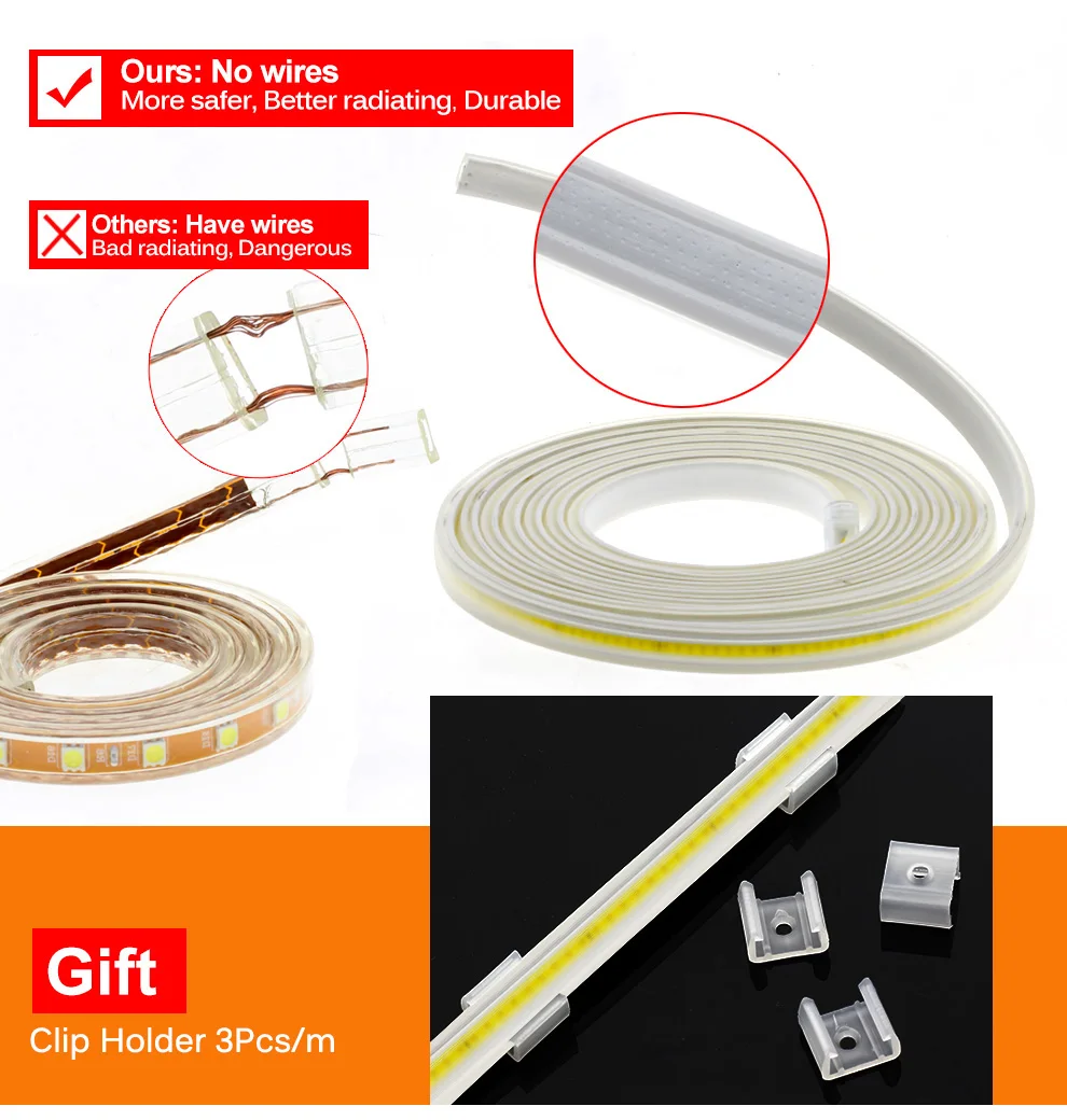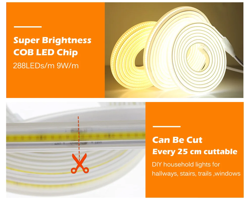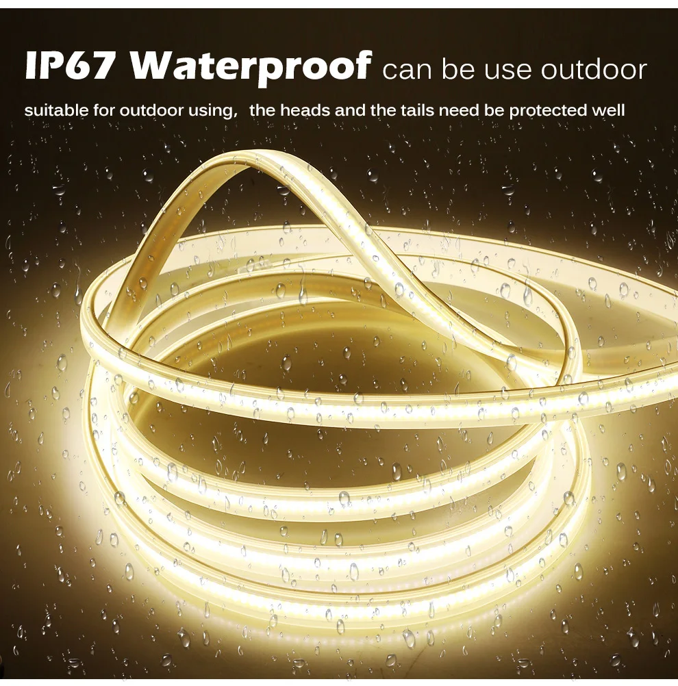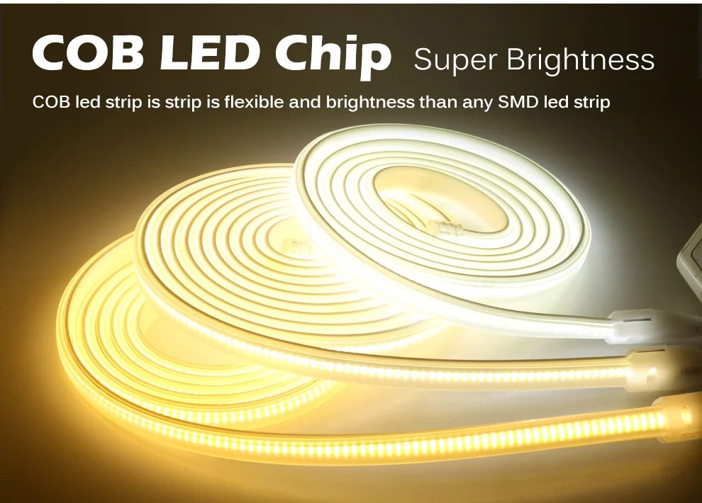 AC220V COB Светодиодная лента высокой плотности гибкий IP67 Водонепроницаемый 288 светодиодов/м 9 Вт/м высокая яркость 3000K 4000K 6000K