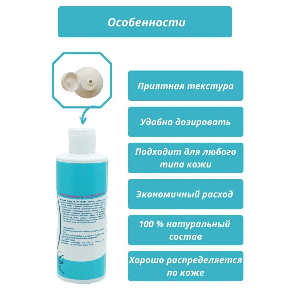 Средство усиливает эффект депиляции, способствуя более легкому удалению коротких и жестких волос. Гипоаллергенен, подходит для любого типа кожи, в том числе чувствительной.