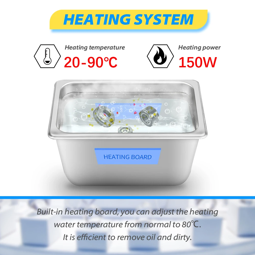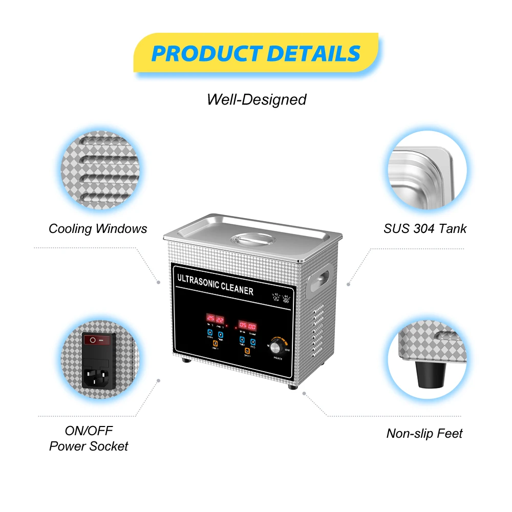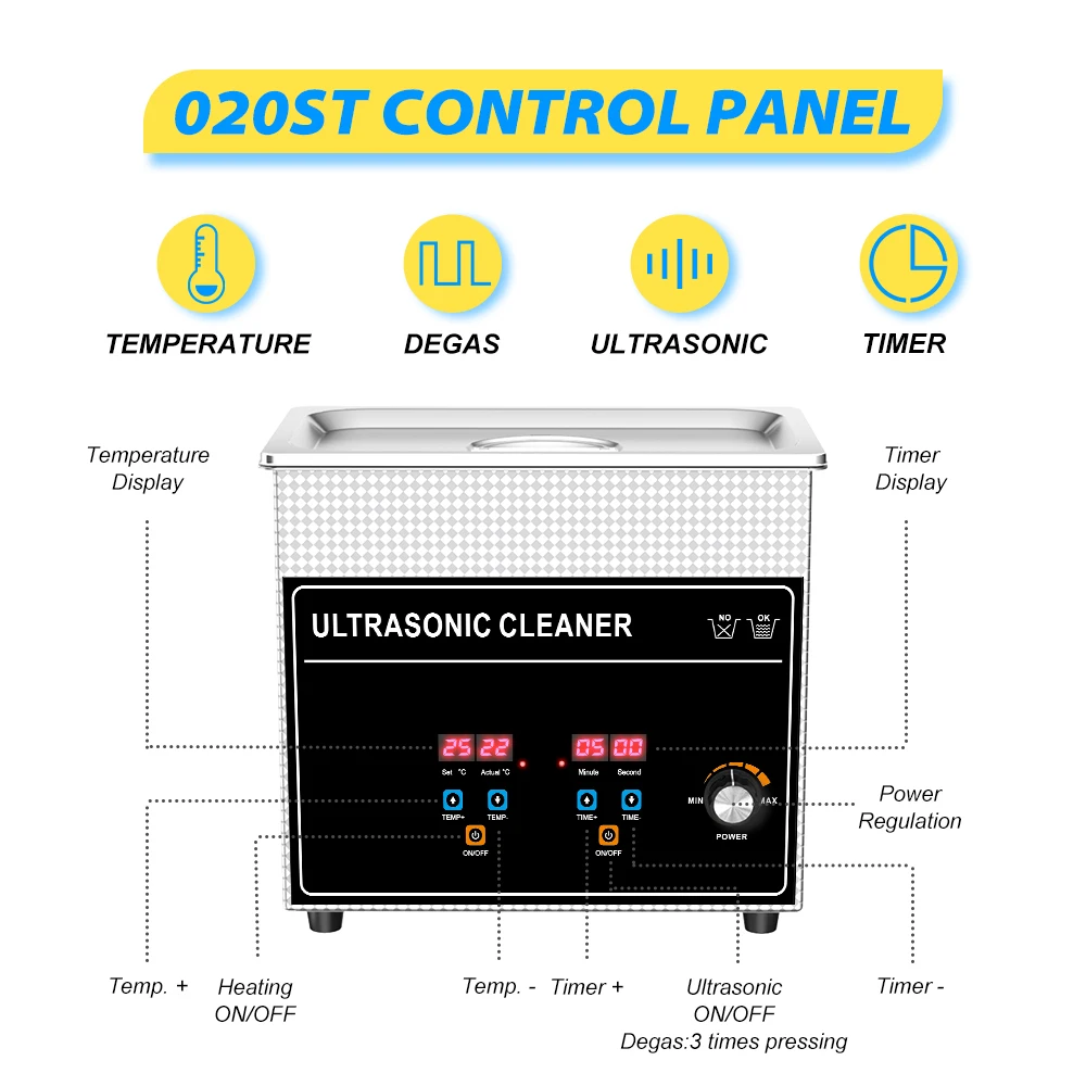 CJ series digital display high-powerUltrasonic cleaning machine model:Features: Convenient and simple function overview: 1. Based on high-performance ultrasonic components matching double protection circuit, high output power; 2. Select high-precision heating device matching constant temperature system, so that the liquid temperature is balanced; 3. Digital display LED The operation is smooth and stable, which improves the sense of operation technology, and has both aesthetic feeling and texture; 4. The ultrasonic cavitation function is balanced, which has the functions of cleaning, dissolving, emulsifying, dispersing, alcohol extraction, defoaming and crushing; 5. The high power output improves the ultrasonic effect, and the effect is obvious, which is suitable for the cleaning application of all kinds of objects; 6. 6L and above models are equipped with drainage system and built-in anti-skid handle; 7. The product has CE / RoHS / FCC certification and intellectual property protection. SPECIFICATION:Frequency: 40kHzTransducer: 2 UnitsHeater power: 150WTime setting: 1-30 minsActual capacity: 2.8L(0.74gal)Theoretical capacity: 3L(0.79gal)Tank size: 240x140x100mm(L*W*H)(9.45x5.51x3.94in)Overall size:265x160x225mm(L*W*H)(10.43x6.3x8.86in) 020 Degas: No020S Degas: YES020SD Degas: YES020ST Degas: YES 020 Semiwave: No020S Semiwave: No020SD Semiwave: YES020ST Semiwave: No 020 Ultrasonic power: 120W020S Ultrasonic power: 120W020SD Ultrasonic power: 120W020ST Ultrasonic power: 30W-120W N/W: 3.6 KG(7.94lb)G/W: 4.5 KG(9.92lb)Power Supply: AC 110V-120V 50/60Hz US/JP plug.AC 220V-240V 50/60Hz EU/UK/AU plug.If you need special request, please leave messages of power and plugs after orde