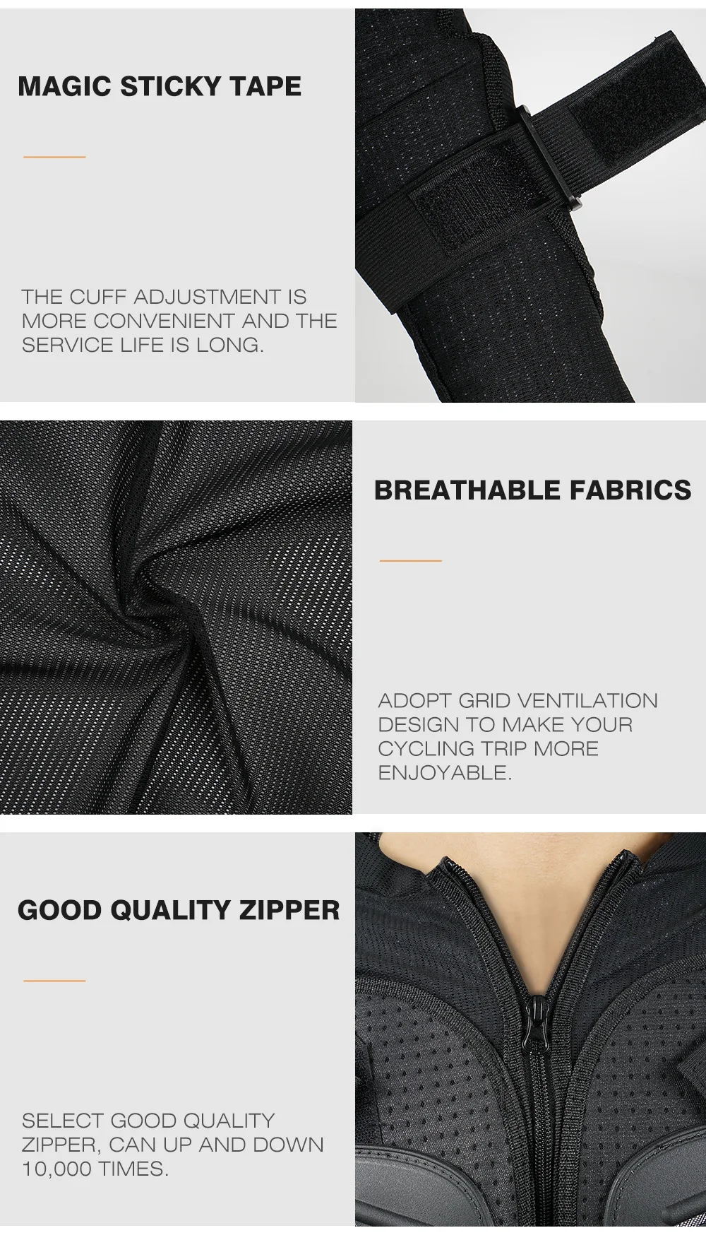 Часть куртки имеет 8 протекторов, 2 из каждого: грудь, плечи, локти, предплечье.