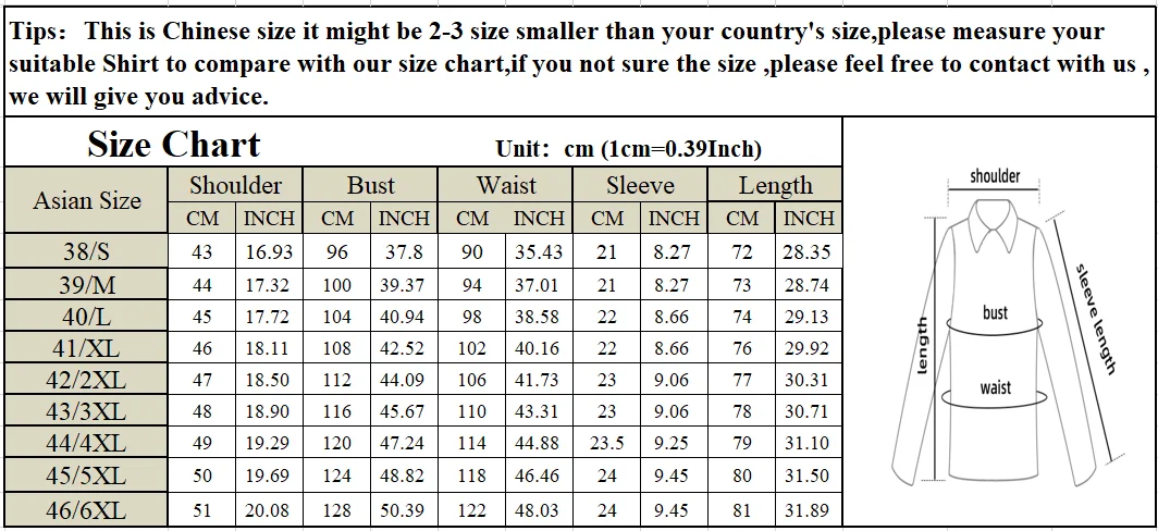Советы: Это китайский размер, который может быть на 2-3 размера меньше, чем размер вашей страны, Пожалуйста, измерьте подходящую рубашку, чтобы сравнить с нашей таблицей размеров, если вы не уверены в размере, пожалуйста, не стесняйтесь связаться с нами, мы дадим вам совет.