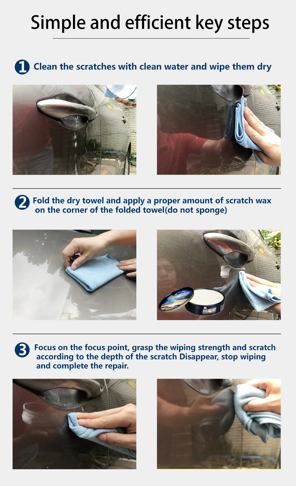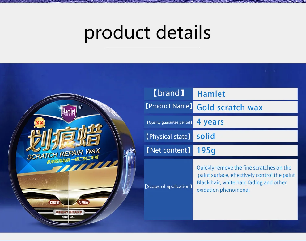 Принцип ремонта: воск для устранения царапин содержит умеренные абразивные частицы. Абразивные частицы протирают Верхние два слоя краски, чтобы постепенно сгладить и заполнить, так что царапины исчезают; Абразивные частицы Гамлета отличаются от обычных абразивов на рынке, И добиться длительного ремонта царапин, не повреждая эффект краски;