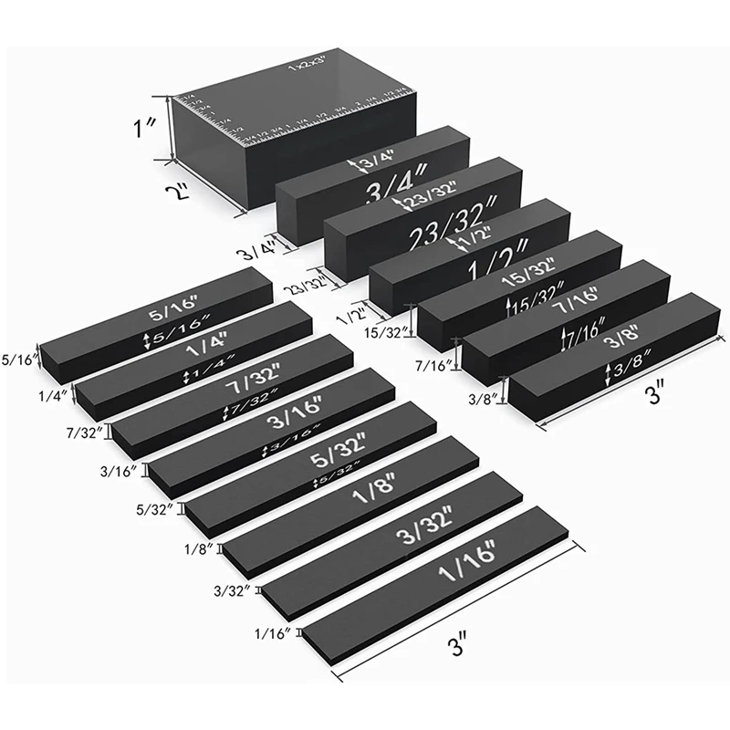 Настройка детали поставляются в металлическом чехол с 1/16 дюймов, 3/32 дюйма, 1/8 Дюймов, 5/32 дюймов, 3/16 дюймов, 7/32 дюйма, 1/4 дюйма, 5/16 дюймов, 3/8 дюйма, 7/16 дюйма, 15/32 дюйма, 1/2 дюйма, 23/32 дюймов, 3/4 дюйма, 1x2x3 дюймовые стержни.