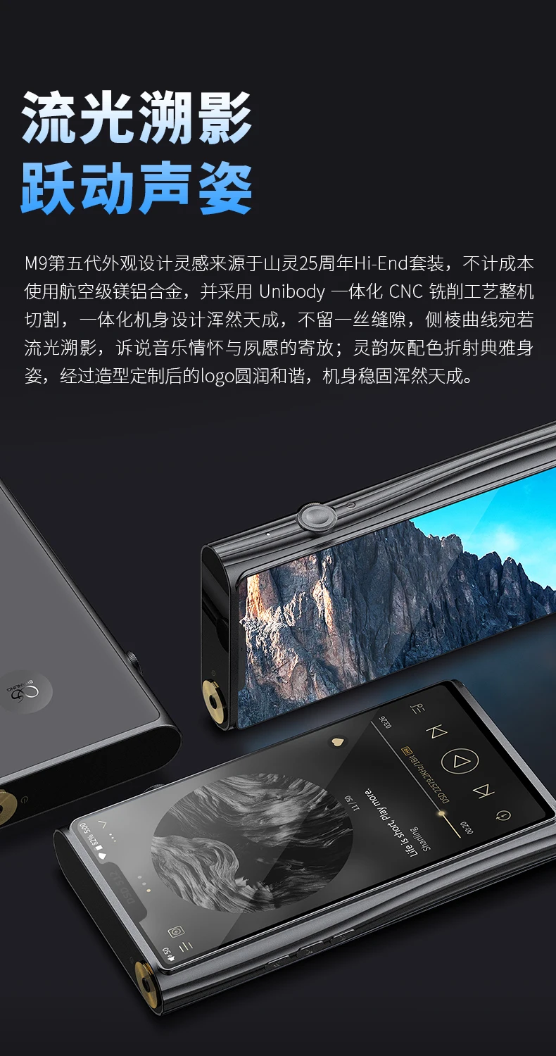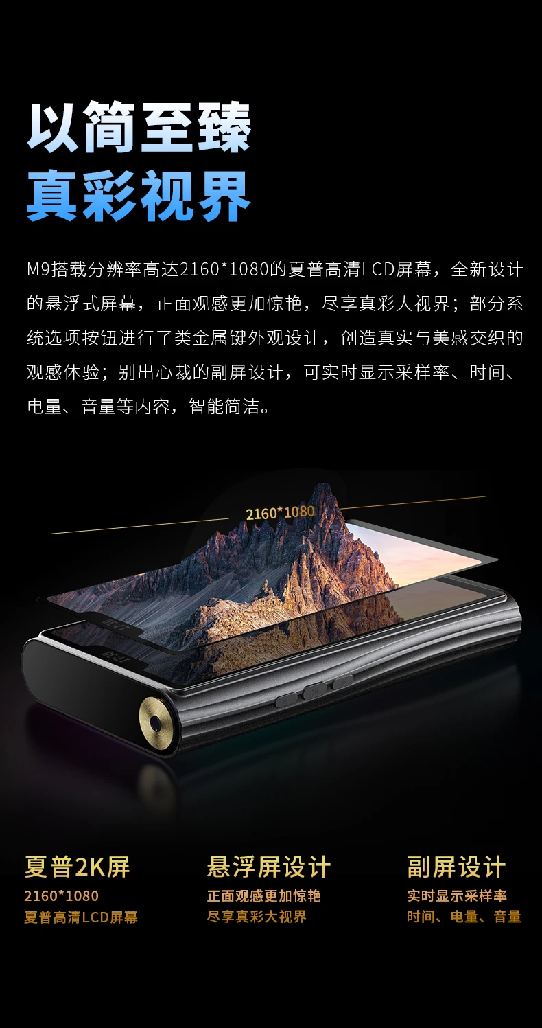 M9 поставляется с совершенно новым дизайном, что делает его выделяться среди наших старых моделей и его конкурентов. M9 также будет нашим самым большим портативный проигрыватель компакт дисков на сегодняшний день, с красивым 6-дюймовый 2K ЖК-дисплей экран. Мы также добавляем меньший экран в выемку дисплея, которая будет показывать основную информацию о Томе, выборке или времени, держать вас в управлении воспроизведением без необходимости включения основного дисплея.
