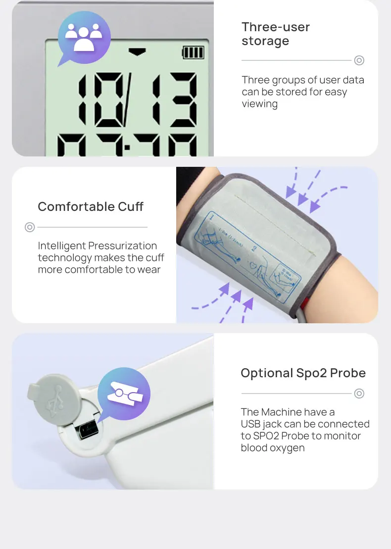 With the functions of time setting, blood pressure measure, user switching and data review. The operation is simple.
