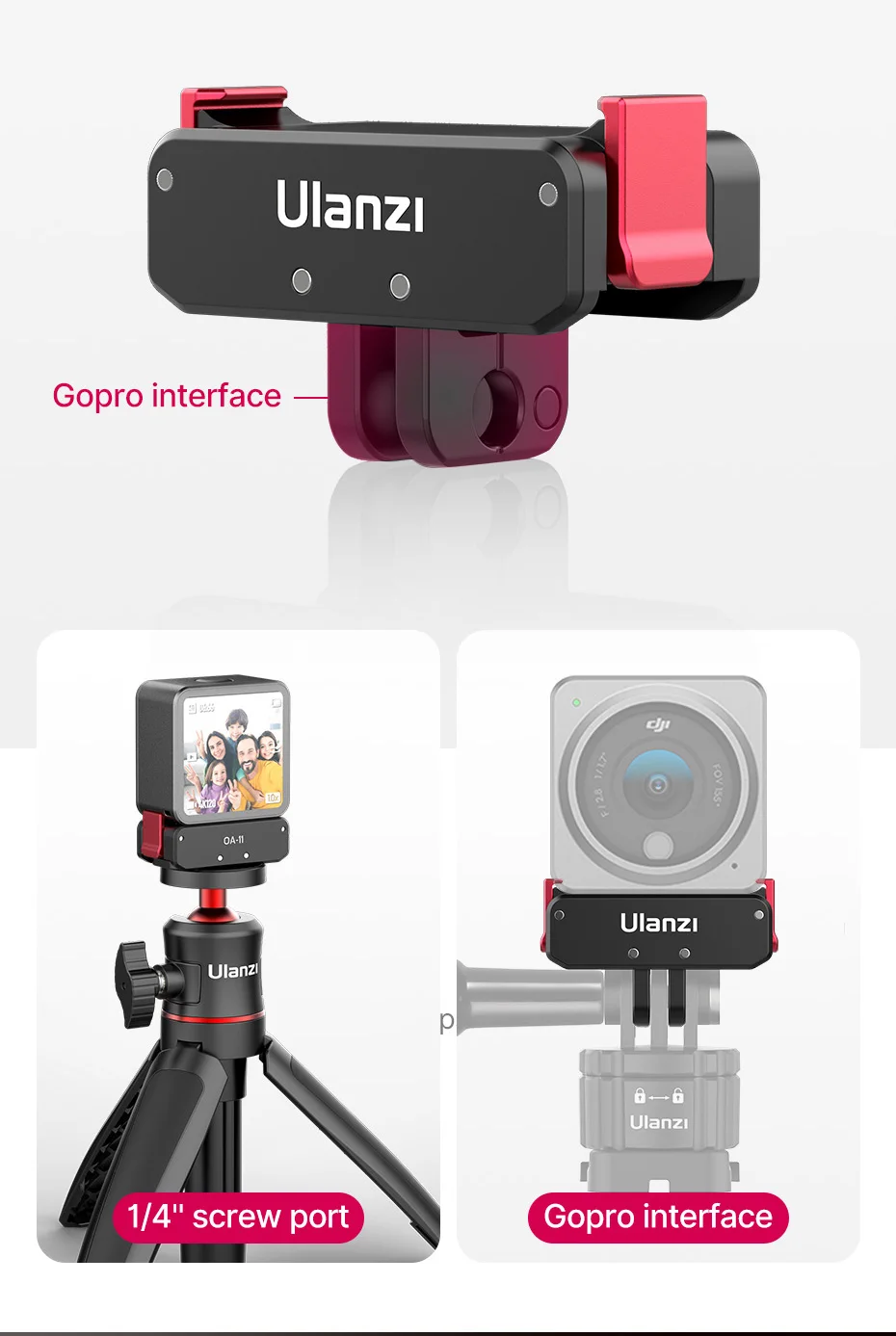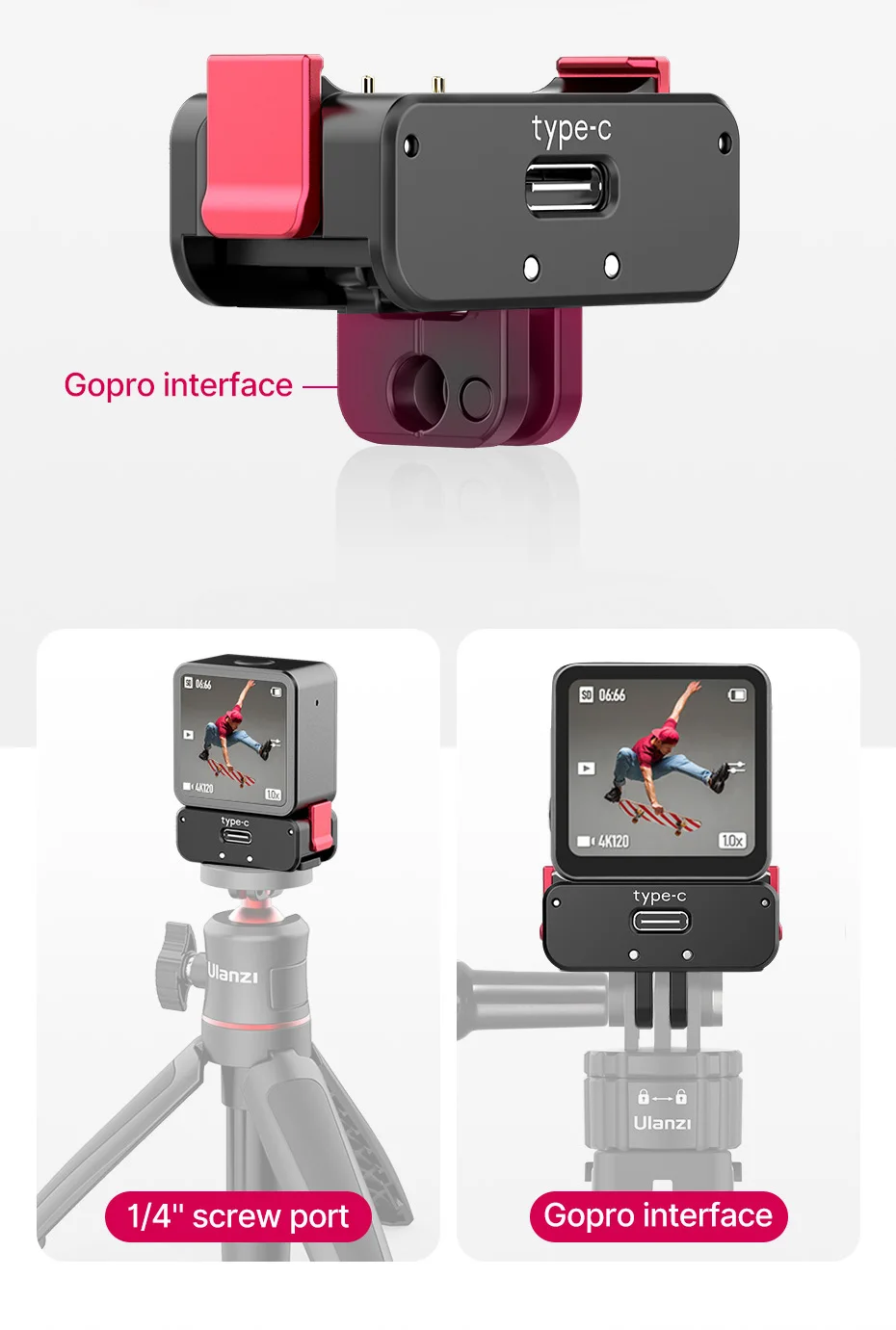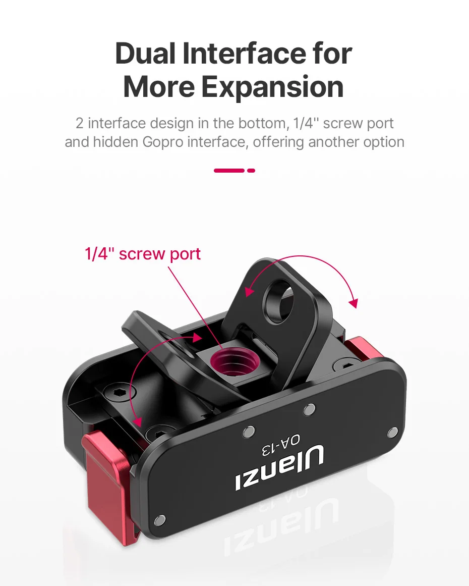 Dual interface for more expansion : 1/4'' screw port | Gopro interface
